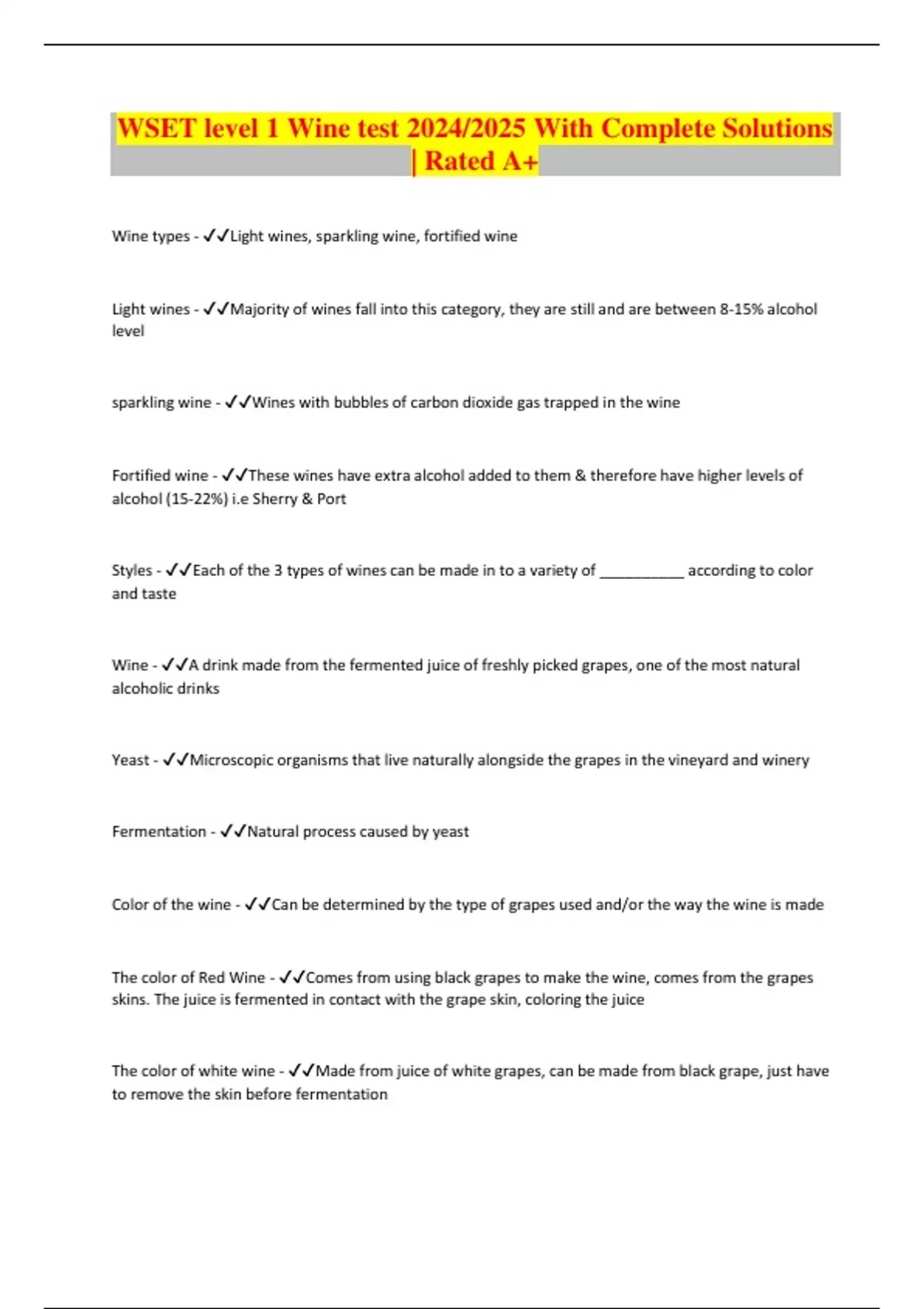 WSET level 1 Wine test 2024/2025 With Complete Solutions | Rated A+ Wine types - Light wines, sparkling wine, fortified wine Light wines - Majority of wines fall into this category, they are still and are between 8-15% alcohol level sparkling wine - Wines with bubbles of carbon dioxide gas trapped in the wine Fortified wine - These wines have extra alcohol added to them & therefore have higher levels of alcohol (15-22%) i.e Sherry & Port Styles - Each of the 3 types of wines can be made in to a variety of __________ according to color and taste Wine - A drink made from the fermented juice of freshly picked grapes, one of the most natural alcoholic drinks Yeast - Microscopic organisms that live naturally alongside the grapes in the vineyard and winery Fermentation - Natural process caused by yeast Color of the wine - Can be determined by the type of grapes used and/or the way the wine is made The color of Red Wine - Comes from using black grapes to make the wine, comes from the grapes skins. The juice is fermented in contact with the grape skin, coloring the juice The color of white wine - Made from juice of white grapes, can be made from black grape, just have to remove the skin before fermentation