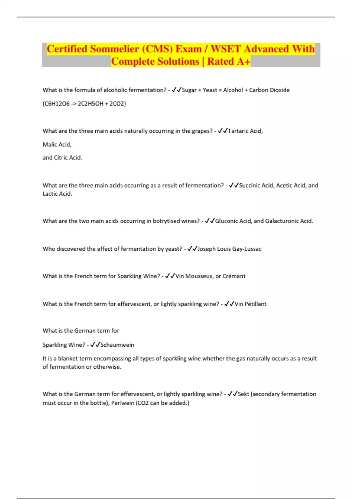Certified Sommelier (CMS) Exam / WSET Advanced With Complete Solutions | Rated A+ What is the formula of alcoholic fermentation? - Sugar + Yeast = Alcohol + Carbon Dioxide (C6H12O6 -> 2C2H5OH + 2CO2) What are the three main acids naturally occurring in the grapes? - Tartaric Acid, Malic Acid, and Citric Acid. What are the three main acids occurring as a result of fermentation? - Succinic Acid, Acetic Acid, and Lactic Acid. What are the two main acids occurring in botrytised wines? - Gluconic Acid, and Galacturonic Acid. Who discovered the effect of fermentation by yeast? - Joseph Louis Gay-Lussac What is the French term for Sparkling Wine? - Vin Mousseux, or Crémant What is the French term for effervescent, or lightly sparkling wine? - Vin Pétillant What is the German term for Sparkling Wine? - Schaumwein It is a blanket term encompassing all types of sparkling wine whether the gas naturally occurs as a result of fermentation or otherwise. What is the German term for effervescent, or lightly sparkling wine? - Sekt (secondary fermentation must occur in the bottle), Perlwein (CO2 can be added.)