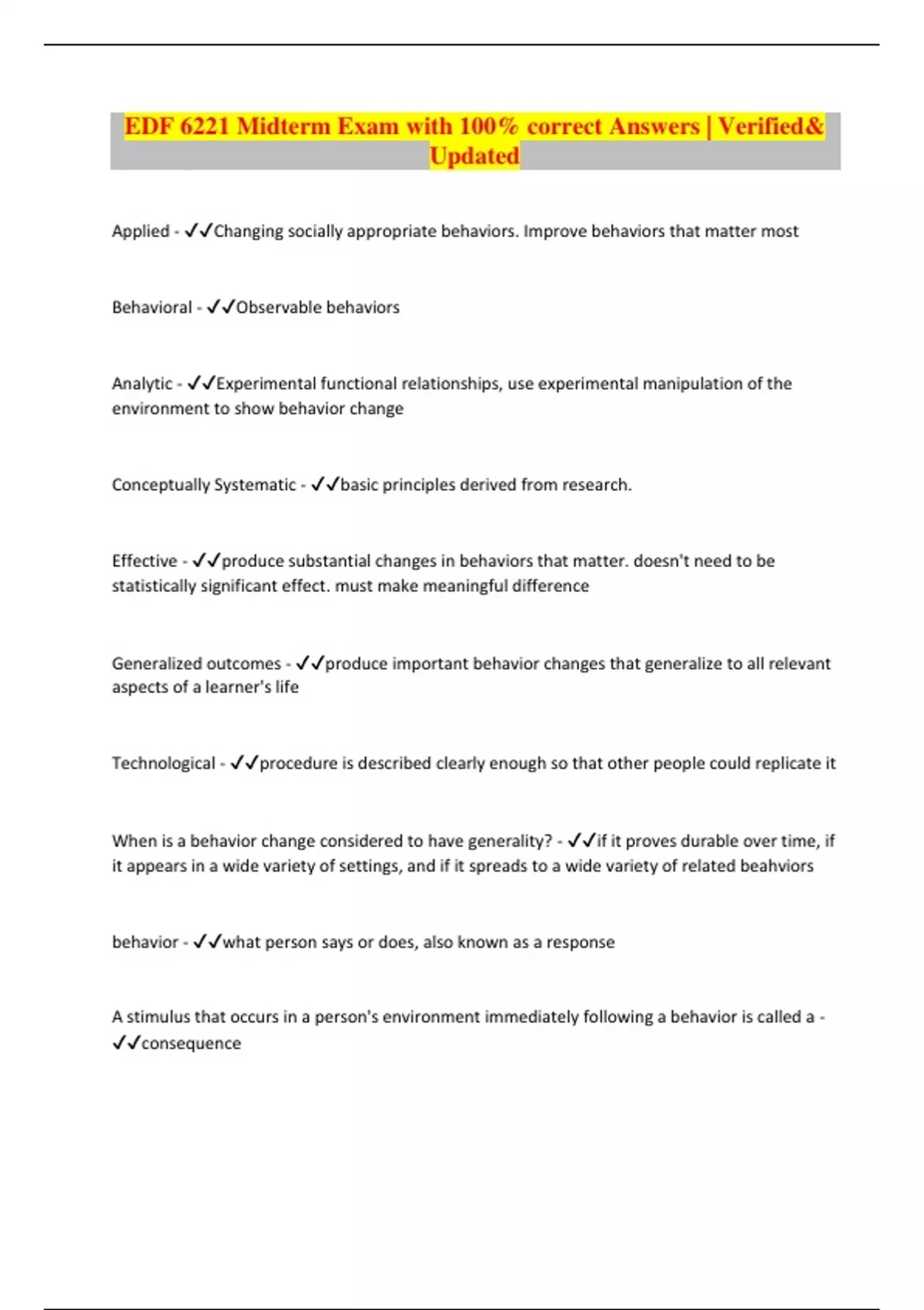 EDF 6221 Midterm Exam with 100% correct Answers | Verified& Updated Applied - Changing socially appropriate behaviors. Improve behaviors that matter most Behavioral - Observable behaviors Analytic - Experimental functional relationships, use experimental manipulation of the environment to show behavior change Conceptually Systematic - basic principles derived from research. Effective - produce substantial changes in behaviors that matter. doesn't need to be statistically significant effect. must make meaningful difference Generalized outcomes - produce important behavior changes that generalize to all relevant aspects of a learner's life Technological - procedure is described clearly enough so that other people could replicate it When is a behavior change considered to have generality? - if it proves durable over time, if it appears in a wide variety of settings, and if it spreads to a wide variety of related beahviors behavior - what person says or does, also known as a response A stimulus that occurs in a person's environment immediately following a behavior is called a - consequence