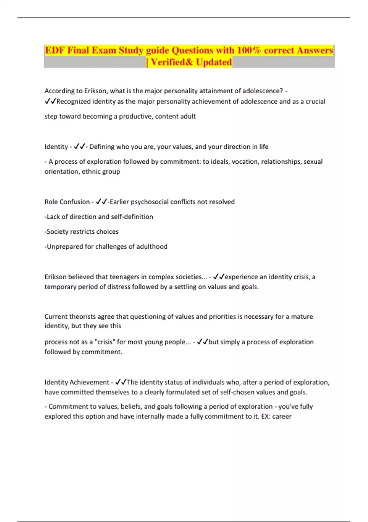 EDF Final Exam Study guide Questions with 100% correct Answers | Verified& Updated According to Erikson, what is the major personality attainment of adolescence? - Recognized identity as the major personality achievement of adolescence and as a crucial step toward becoming a productive, content adult Identity - - Defining who you are, your values, and your direction in life - A process of exploration followed by commitment: to ideals, vocation, relationships, sexual orientation, ethnic group Role Confusion - -Earlier psychosocial conflicts not resolved -Lack of direction and self-definition -Society restricts choices -Unprepared for challenges of adulthood Erikson believed that teenagers in complex societies... - experience an identity crisis, a temporary period of distress followed by a settling on values and goals.