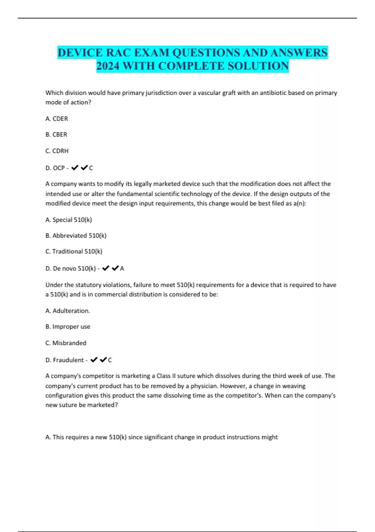 DEVICE RAC EXAM QUESTIONS AND ANSWERS 2024 WITH COMPLETE SOLUTION Which division would have primary jurisdiction over a vascular graft with an antibiotic based on primary mode of action? A. CDER B. CBER C. CDRH D. OCP - C A company wants to modify its legally marketed device such that the modification does not affect the intended use or alter the fundamental scientific technology of the device. If the design outputs of the modified device meet the design input requirements, this change would be best filed as a(n): A. Special 510(k) B. Abbreviated 510(k) C. Traditional 510(k) D. De novo 510(k) - A Under the statutory violations, failure to meet 510(k) requirements for a device that is required to have a 510(k) and is in commercial distribution is considered to be: A. Adulteration. B. Improper use C. Misbranded D. Fraudulent - C A company's competitor is marketing a Class II suture which dissolves during the third week of use. The company's current product has to be removed by a physician. However, a change in weaving configuration gives this product the same dissolving time as the competitor's. When can the company's new suture be marketed? A. This requires a new 510(k) since significant change in product instructions might