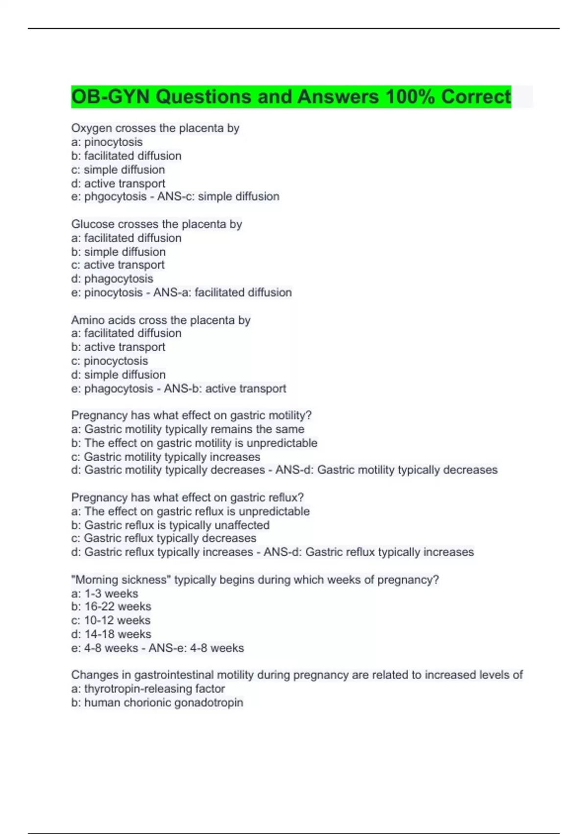 ob gyn questions and answers 100 correct