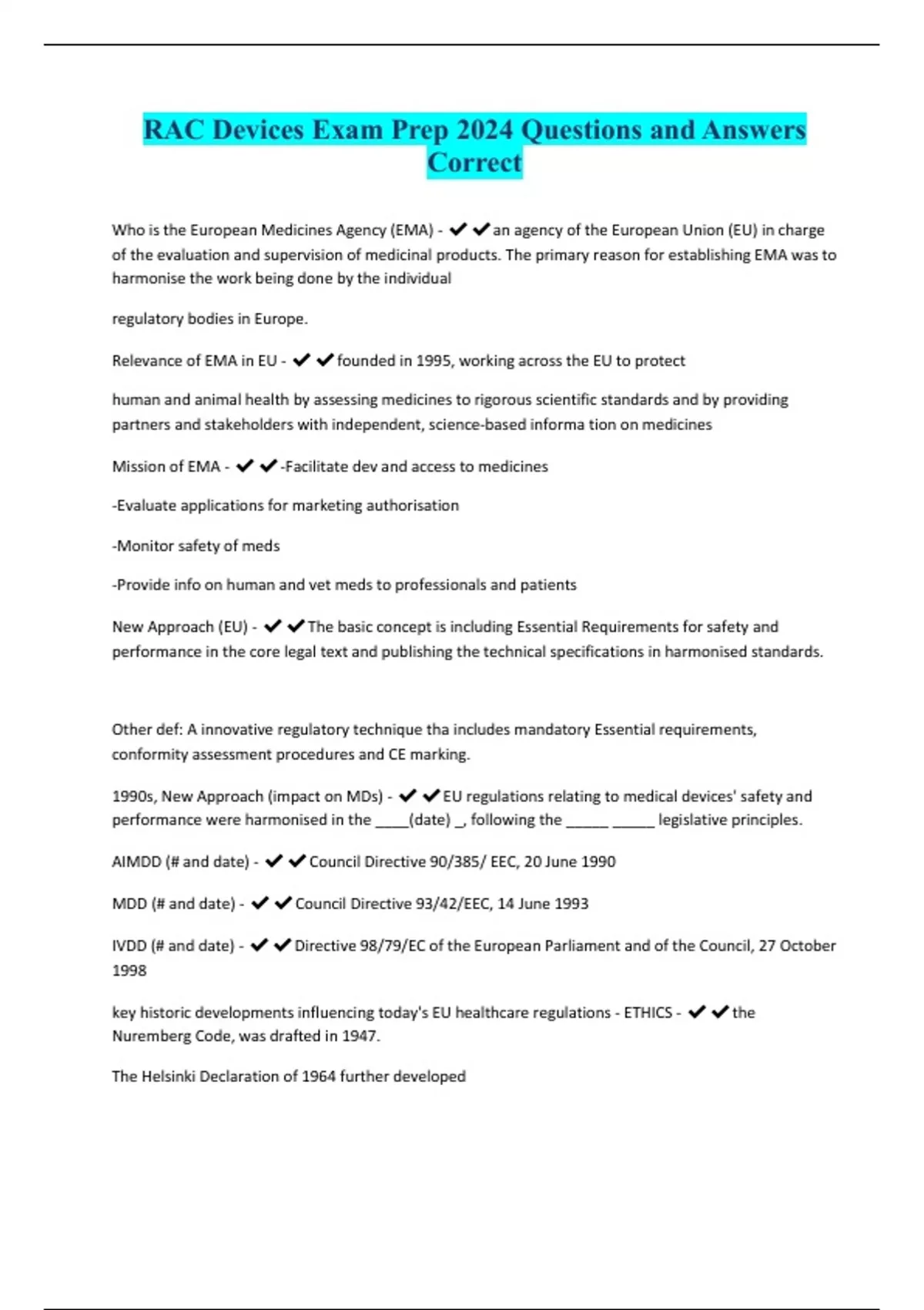 RAC Devices Exam Prep 2024 Questions and Answers Correct Who is the European Medicines Agency (EMA) - an agency of the European Union (EU) in charge of the evaluation and supervision of medicinal products. The primary reason for establishing EMA was to harmonise the work being done by the individual regulatory bodies in Europe. Relevance of EMA in EU - founded in 1995, working across the EU to protect human and animal health by assessing medicines to rigorous scientific standards and by providing partners and stakeholders with independent, science-based informa tion on medicines Mission of EMA - -Facilitate dev and access to medicines -Evaluate applications for marketing authorisation -Monitor safety of meds -Provide info on human and vet meds to professionals and patients New Approach (EU) - The basic concept is including Essential Requirements for safety and performance in the core legal text and publishing the technical specifications in harmonised standards. Other def: A innovative regulatory technique tha includes mandatory Essential requirements, conformity assessment procedures and CE marking. 1990s, New Approach (impact on MDs) - EU regulations relating to medical devices' safety and performance were harmonised in the ____(date) _, following the _____ _____ legislative principles. AIMDD (# and date) - Council Directive 90/385/ EEC, 20 June 1990 MDD (# and date) - Council Directive 93/42/EEC, 14 June 1993 IVDD (# and date) - Directive 98/79/EC of the European Parliament and of the Council, 27 October 1998 key historic developments influencing today's EU healthcare regulations - ETHICS - the Nuremberg Code, was drafted in 1947. The Helsinki Declaration of 1964 further developed