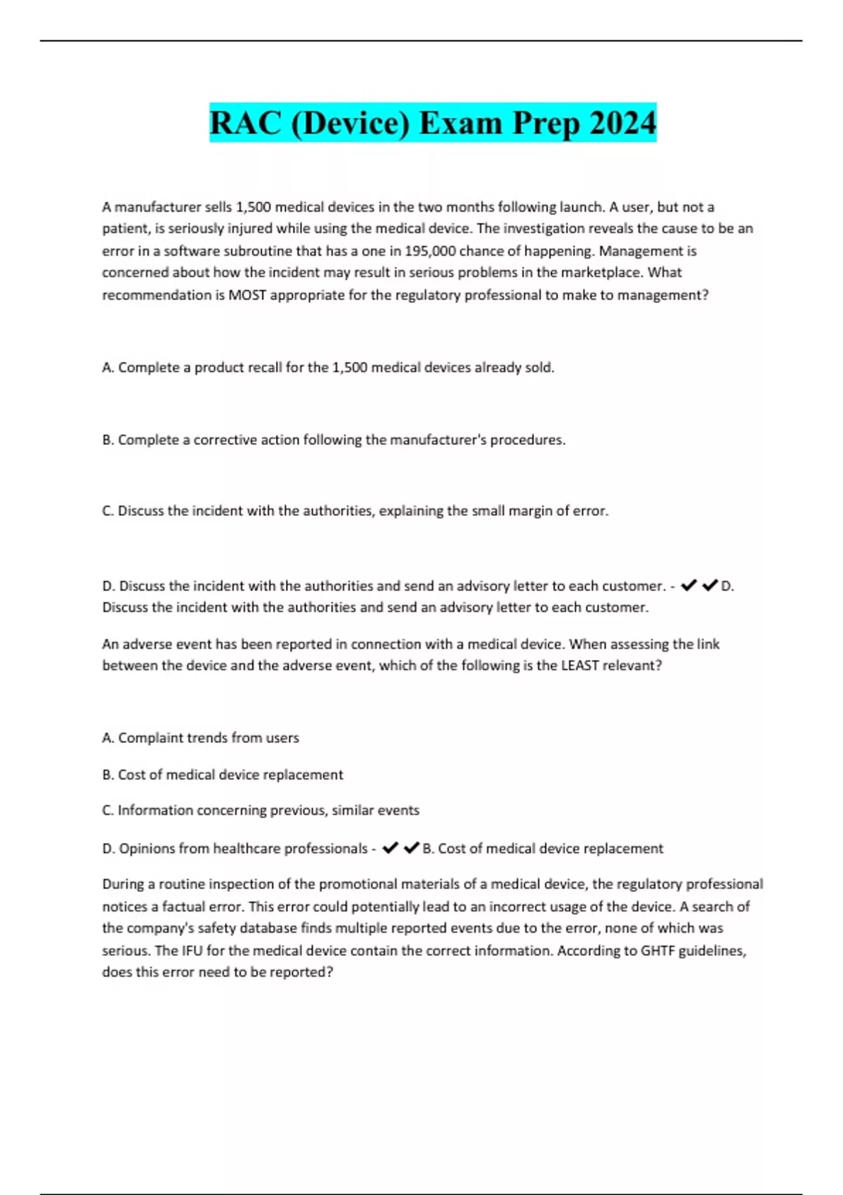 RAC (Device) Exam Prep 2024 A manufacturer sells 1,500 medical devices in the two months following launch. A user, but not a patient, is seriously injured while using the medical device. The investigation reveals the cause to be an error in a software subroutine that has a one in 195,000 chance of happening. Management is concerned about how the incident may result in serious problems in the marketplace. What recommendation is MOST appropriate for the regulatory professional to make to management? A. Complete a product recall for the 1,500 medical devices already sold. B. Complete a corrective action following the manufacturer's procedures. C. Discuss the incident with the authorities, explaining the small margin of error. D. Discuss the incident with the authorities and send an advisory letter to each customer. - D. Discuss the incident with the authorities and send an advisory letter to each customer. An adverse event has been reported in connection with a medical device. When assessing the link between the device and the adverse event, which of the following is the LEAST relevant? A. Complaint trends from users B. Cost of medical device replacement C. Information concerning previous, similar events D. Opinions from healthcare professionals - B. Cost of medical device replacement During a routine inspection of the promotional materials of a medical device, the regulatory professional notices a factual error. This error could potentially lead to an incorrect usage of the device. A search of the company's safety database finds multiple reported events due to the error, none of which was serious. The IFU for the medical device contain the correct information. According to GHTF guidelines, does this error need to be reported?