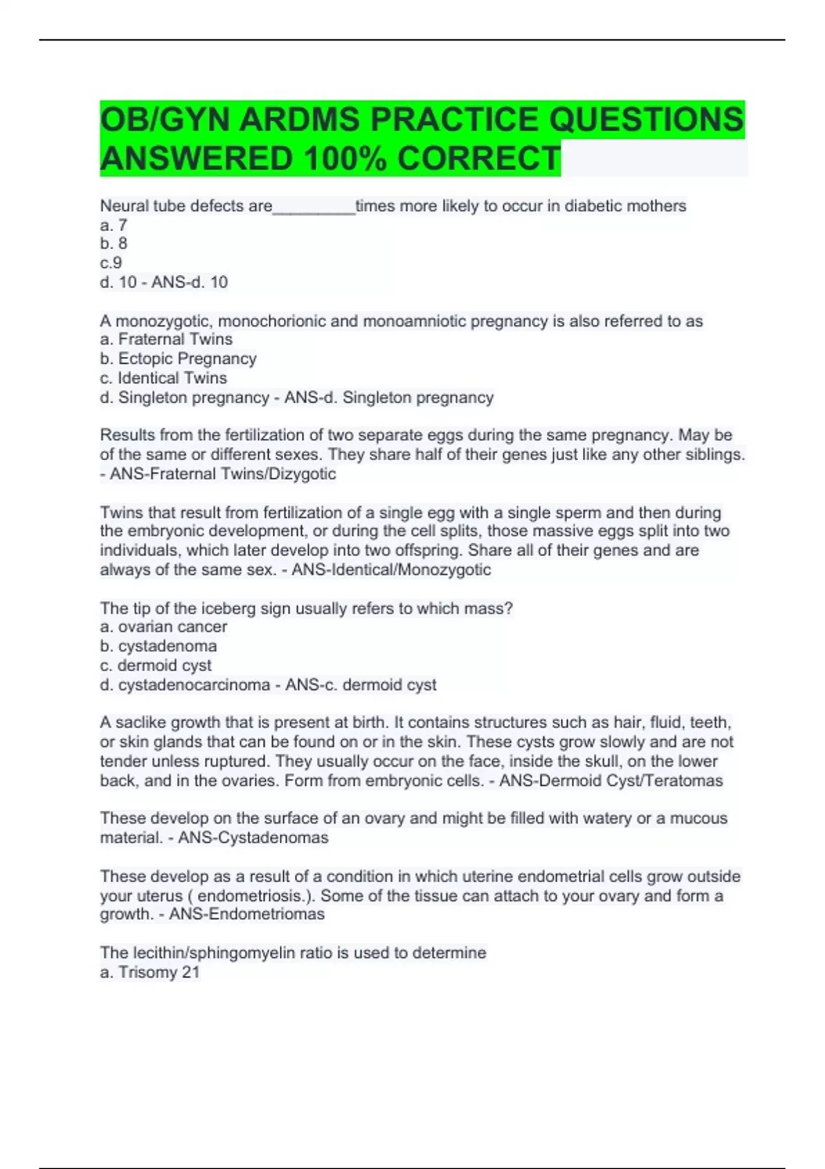 OBGYN ARDMS PRACTICE QUESTIONS ANSWERED 100% CORRECT