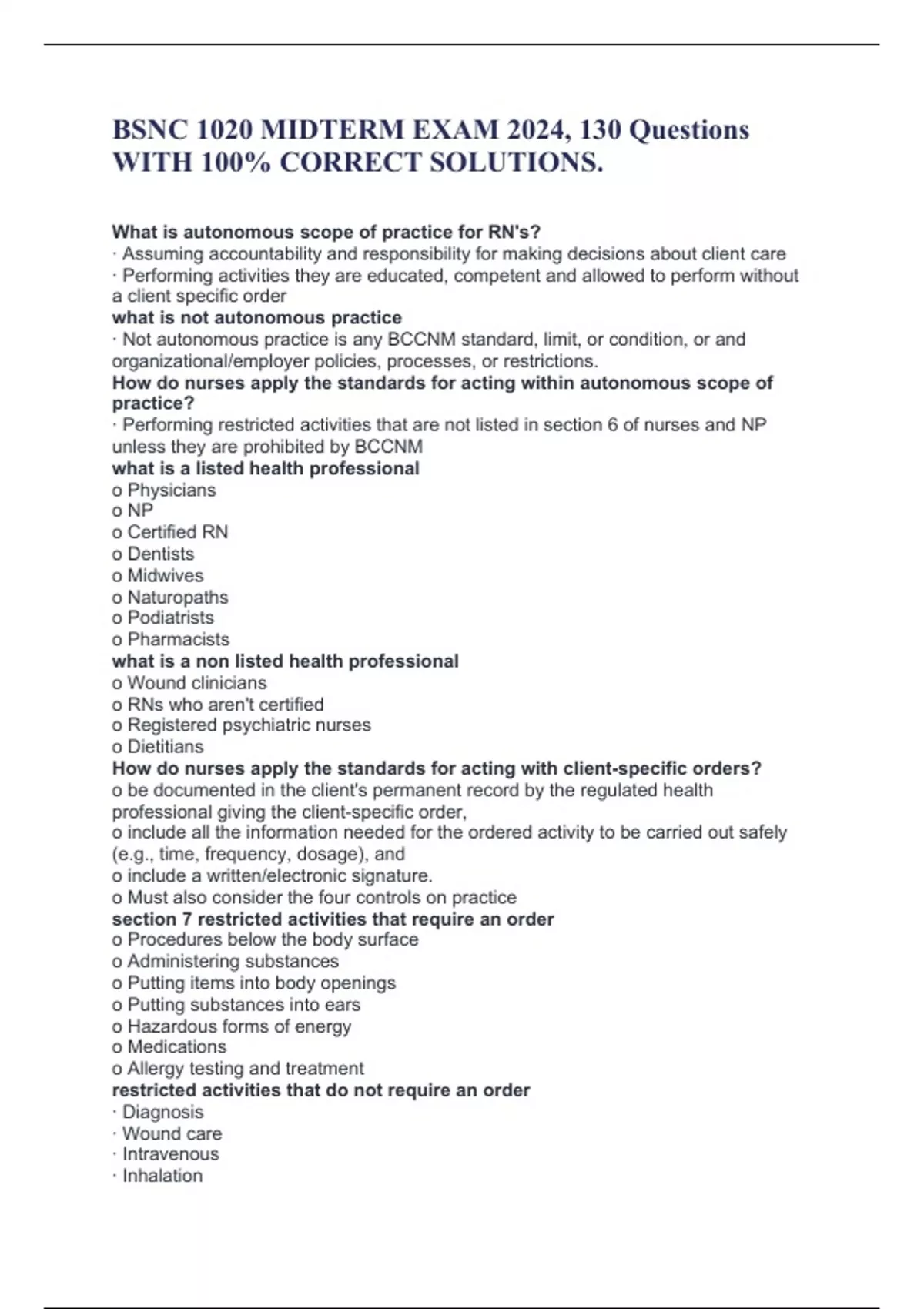 BSNC 1020 MIDTERM EXAM 2024, 130 Questions WITH 100% CORRECT SOLUTIONS. What is autonomous scope of practice for RN's? · Assuming accountability and responsibility for making decisions about client care · Performing activities they are educated, competent and allowed to perform without a client specific order what is not autonomous practice · Not autonomous practice is any BCCNM standard, limit, or condition, or and organizational/employer policies, processes, or restrictions. How do nurses apply the standards for acting within autonomous scope of practice? · Performing restricted activities that are not listed in section 6 of nurses and NP unless they are prohibited by BCCNM what is a listed health professional o Physicians o NP o Certified RN o Dentists o Midwives o Naturopaths o Podiatrists o Pharmacists what is a non listed health professional o Wound clinicians o RNs who aren't certified o Registered psychiatric nurses o Dietitians How do nurses apply the standards for acting with client-specific orders? o be documented in the client's permanent record by the regulated health professional giving the client-specific order, o include all the information needed for the ordered activity to be carried out safely (e.g., time, frequency, dosage), and o include a written/electronic signature. o Must also consider the four controls on practice section 7 restricted activities that require an order o Procedures below the body surface o Administering substances o Putting items into body openings o Putting substances into ears o Hazardous forms of energy o Medications o Allergy testing and treatment restricted activities that do not require an order · Diagnosis · Wound care · Intravenous · Inhalation