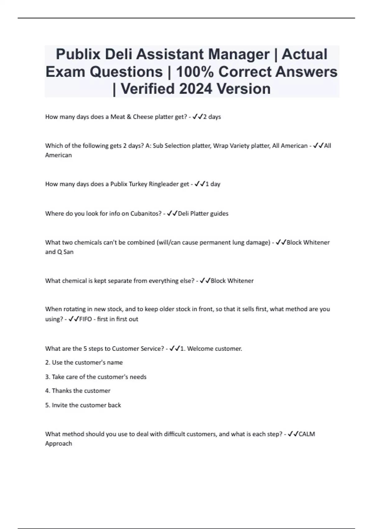 Publix Deli Assistant Manager | Actual Exam Questions | 100% Correct Answers | Verified 2024 Version