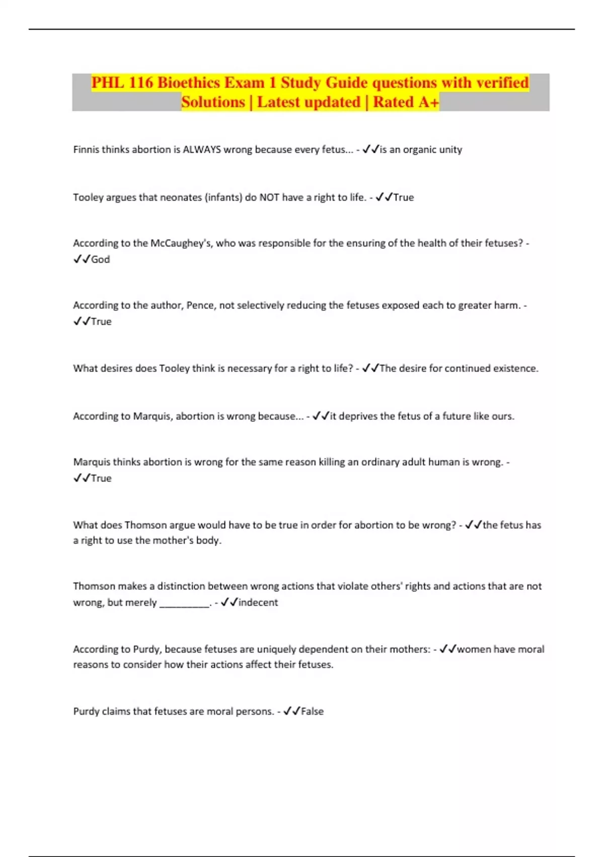 PHL 116 Bioethics Exam 1 Study Guide questions with verified Solutions | Latest updated | Rated A+ Finnis thinks abortion is ALWAYS wrong because every fetus... - is an organic unity Tooley argues that neonates (infants) do NOT have a right to life. - True According to the McCaughey's, who was responsible for the ensuring of the health of their fetuses? - God According to the author, Pence, not selectively reducing the fetuses exposed each to greater harm. - True What desires does Tooley think is necessary for a right to life? - The desire for continued existence. According to Marquis, abortion is wrong because... - it deprives the fetus of a future like ours. Marquis thinks abortion is wrong for the same reason killing an ordinary adult human is wrong. - True What does Thomson argue would have to be true in order for abortion to be wrong? - the fetus has a right to use the mother's body. Thomson makes a distinction between wrong actions that violate others' rights and actions that are not wrong, but merely _________. - indecent According to Purdy, because fetuses are uniquely dependent on their mothers: - women have moral reasons to consider how their actions affect their fetuses. Purdy claims that fetuses are moral persons. - False
