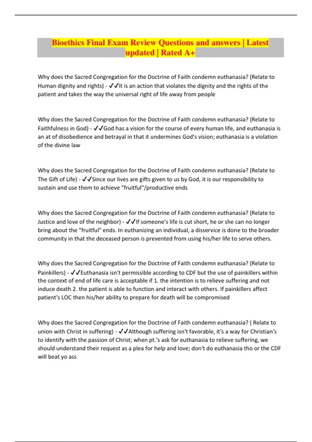 Bioethics Final Exam Review Questions and answers | Latest updated | Rated A+ Why does the Sacred Congregation for the Doctrine of Faith condemn euthanasia? (Relate to Human dignity and rights) - It is an action that violates the dignity and the rights of the patient and takes the way the universal right of life away from people Why does the Sacred Congregation for the Doctrine of Faith condemn euthanasia? (Relate to Faithfulness in God) - God has a vision for the course of every human life, and euthanasia is an at of disobedience and betrayal in that it undermines God's vision; euthanasia is a violation of the divine law Why does the Sacred Congregation for the Doctrine of Faith condemn euthanasia? (Relate to The Gift of Life) - Since our lives are gifts given to us by God, it is our responsibility to sustain and use them to achieve "fruitful"/productive ends Why does the Sacred Congregation for the Doctrine of Faith condemn euthanasia? (Relate to Justice and love of the neighbor) - If someone's life is cut short, he or she can no longer bring about the "fruitful" ends. In euthanizing an individual, a disservice is done to the broader community in that the deceased person is prevented from using his/her life to serve others. Why does the Sacred Congregation for the Doctrine of Faith condemn euthanasia? (Relate to Painkillers) - Euthanasia isn't permissible according to CDF but the use of painkillers within the context of end of life care is acceptable if 1. the intention is to relieve suffering and not induce death 2. the patient is able to function and interact with others. If painkillers affect patient's LOC then his/her ability to prepare for death will be compromised Why does the Sacred Congregation for the Doctrine of Faith condemn euthanasia? ( Relate to union with Christ in suffering) - Although suffering isn't favorable, it's a way for Christian's to identify with the passion of Christ; when pt.'s ask for euthanasia to relieve suffering, we should understand their request as a plea for help and love; don't do euthanasia tho or the CDF will beat yo ass