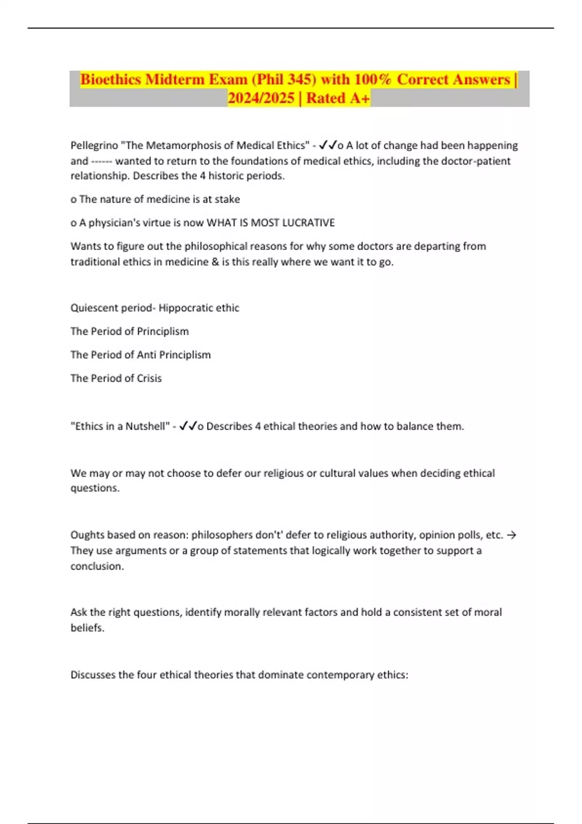Bioethics Midterm Exam (Phil 345) with 100% Correct Answers | 2024/2025 | Rated A+ Pellegrino "The Metamorphosis of Medical Ethics" - o A lot of change had been happening and ------ wanted to return to the foundations of medical ethics, including the doctor-patient relationship. Describes the 4 historic periods. o The nature of medicine is at stake o A physician's virtue is now WHAT IS MOST LUCRATIVE Wants to figure out the philosophical reasons for why some doctors are departing from traditional ethics in medicine & is this really where we want it to go. Quiescent period- Hippocratic ethic The Period of Principlism The Period of Anti Principlism The Period of Crisis "Ethics in a Nutshell" - o Describes 4 ethical theories and how to balance them. We may or may not choose to defer our religious or cultural values when deciding ethical questions. Oughts based on reason: philosophers don't' defer to religious authority, opinion polls, etc. → They use arguments or a group of statements that logically work together to support a conclusion.