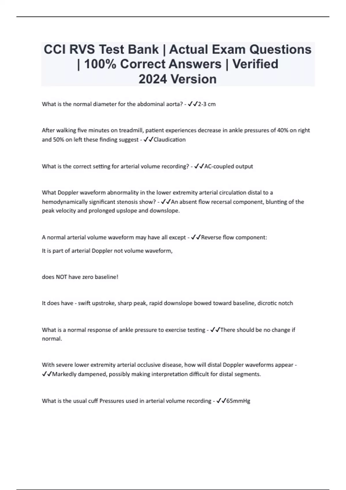 What is the normal diameter for the abdominal aorta? - 2-3 cm After walking five minutes on treadmill, patient experiences decrease in ankle pressures of 40% on right and 50% on left these finding suggest - Claudication What is the correct setting for arterial volume recording? - AC-coupled output What Doppler waveform abnormality in the lower extremity arterial circulation distal to a hemodynamically significant stenosis show? - An absent flow recersal component, blunting of the peak velocity and prolonged upslope and downslope. A normal arterial volume waveform may have all except - Reverse flow component: It is part of arterial Doppler not volume waveform,
