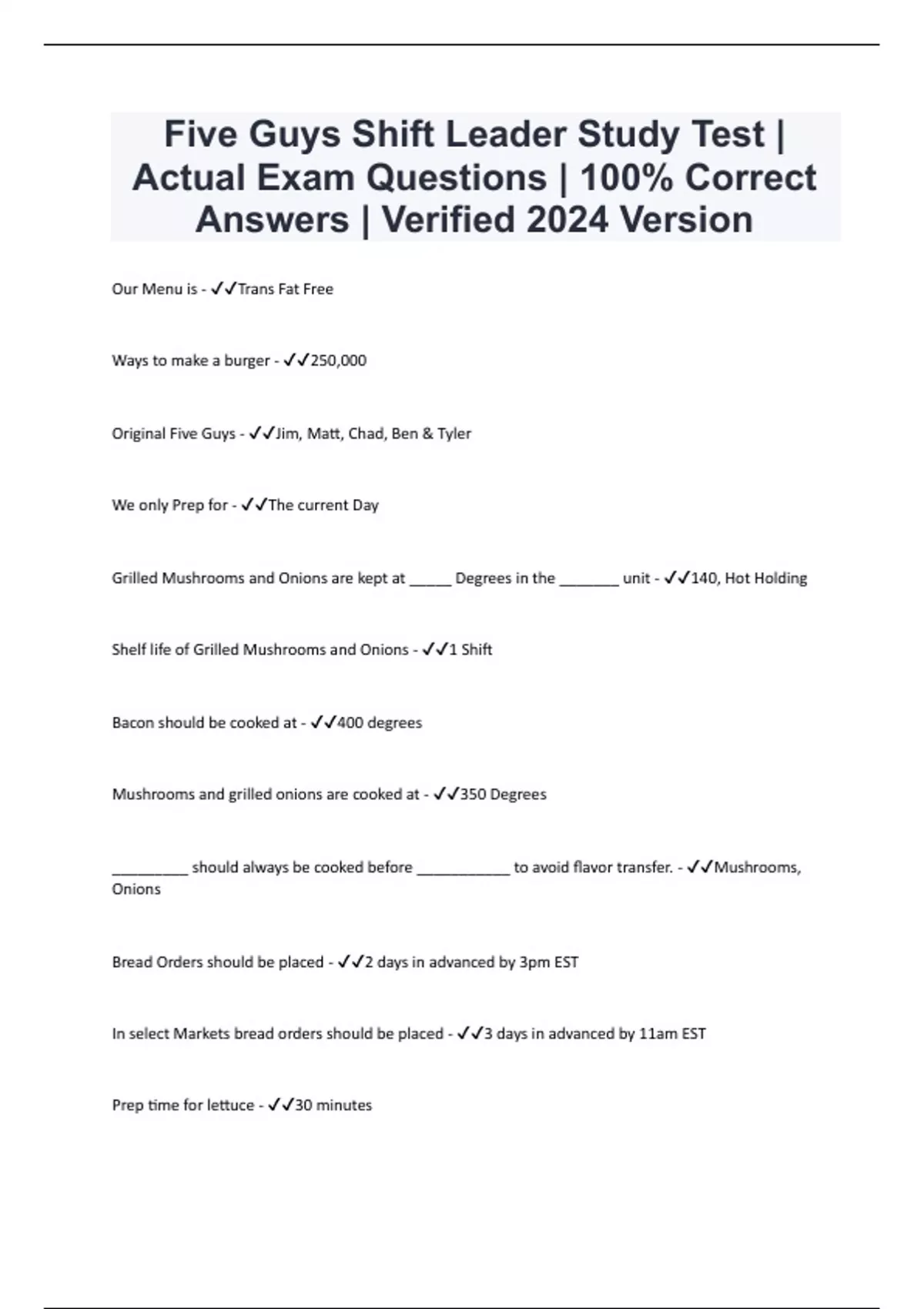 Five Guys Shift Leader Study Test | Actual Exam Questions | 100% Correct Answers | Verified 2024 Version