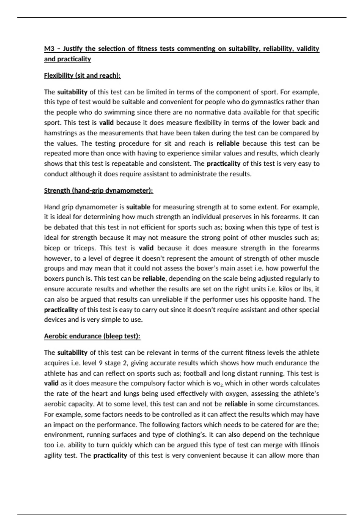 M3 – Justify the selection of fitness tests commenting on suitability, reliability, validity