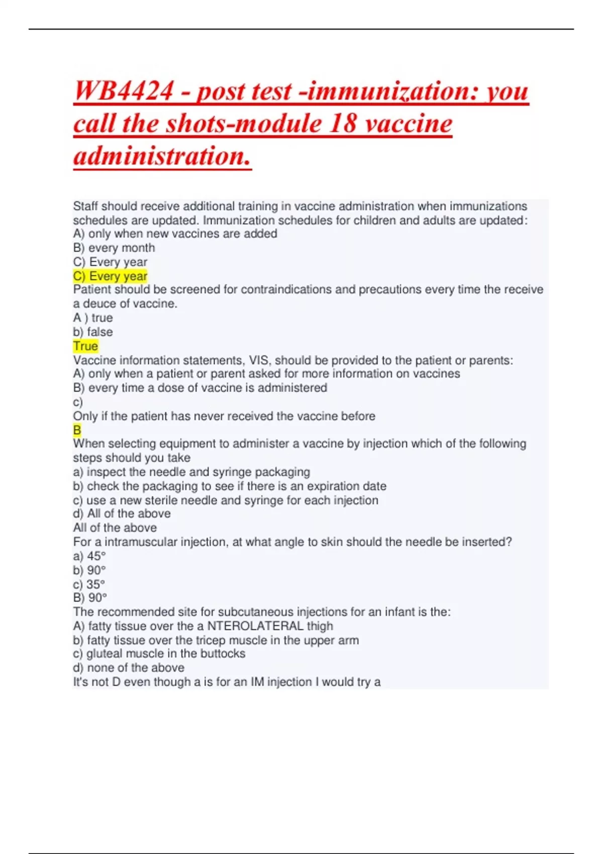 Staff should receive additional training in vaccine administration when immunizations schedules are updated. Immunization schedules for children and adults are updated: A) only when new vaccines are added B) every month C) Every year C) Every year Patient should be screened for contraindications and precautions every time the receive a deuce of vaccine. A ) true b) fals