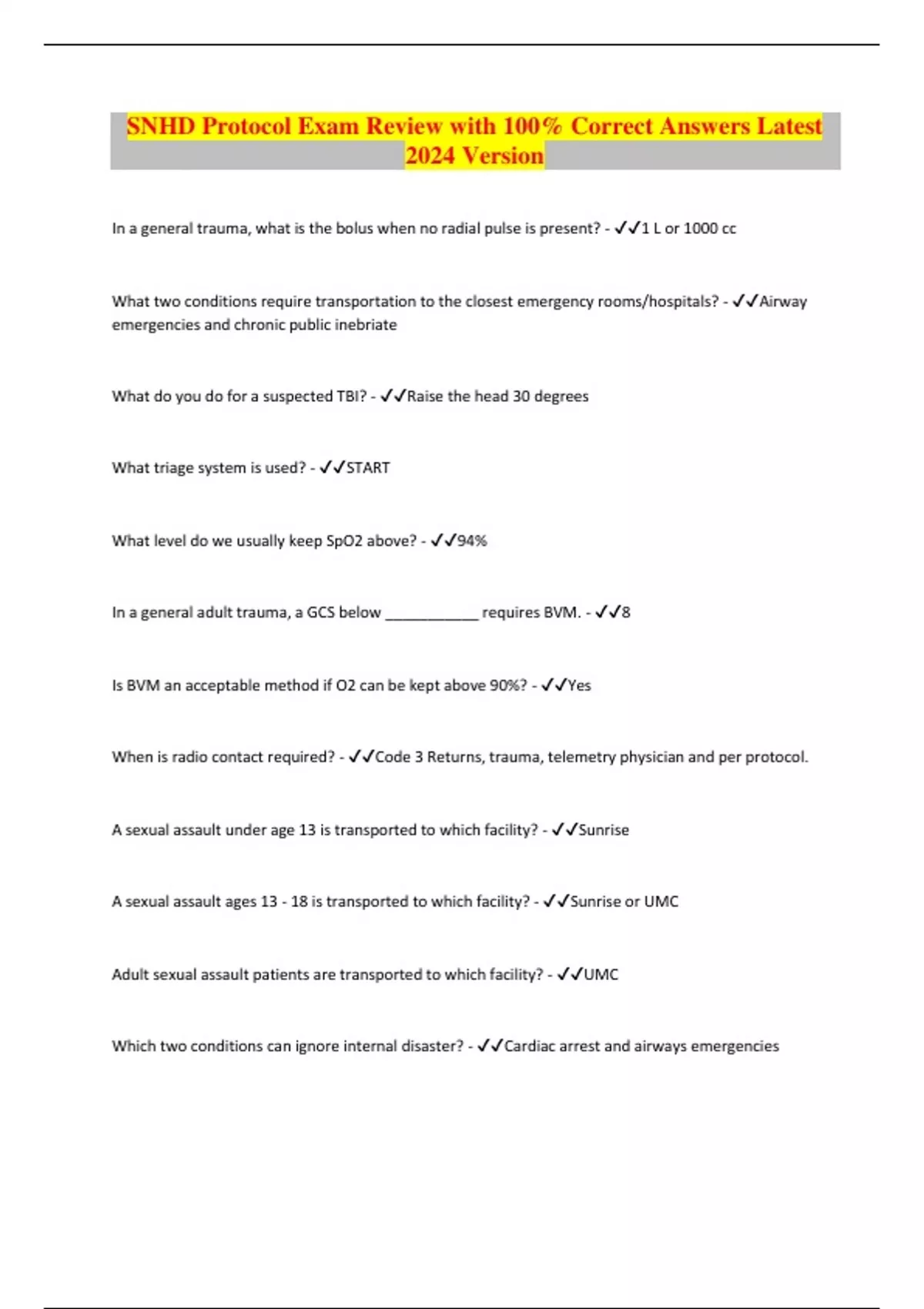 SNHD Protocol Exam Review with 100% Correct Answers Latest 2024 Version In a general trauma, what is the bolus when no radial pulse is present? - 1 L or 1000 cc What two conditions require transportation to the closest emergency rooms/hospitals? - Airway emergencies and chronic public inebriate What do you do for a suspected TBI? - Raise the head 30 degrees What triage system is used? - START What level do we usually keep SpO2 above? - 94% In a general adult trauma, a GCS below ___________ requires BVM. - 8 Is BVM an acceptable method if O2 can be kept above 90%? - Yes When is radio contact required? - Code 3 Returns, trauma, telemetry physician and per protocol. A sexual assault under age 13 is transported to which facility? - Sunrise A sexual assault ages 13 - 18 is transported to which facility? - Sunrise or UMC Adult sexual assault patients are transported to which facility? - UMC Which two conditions can ignore internal disaster? - Cardiac arrest and airways emergencies