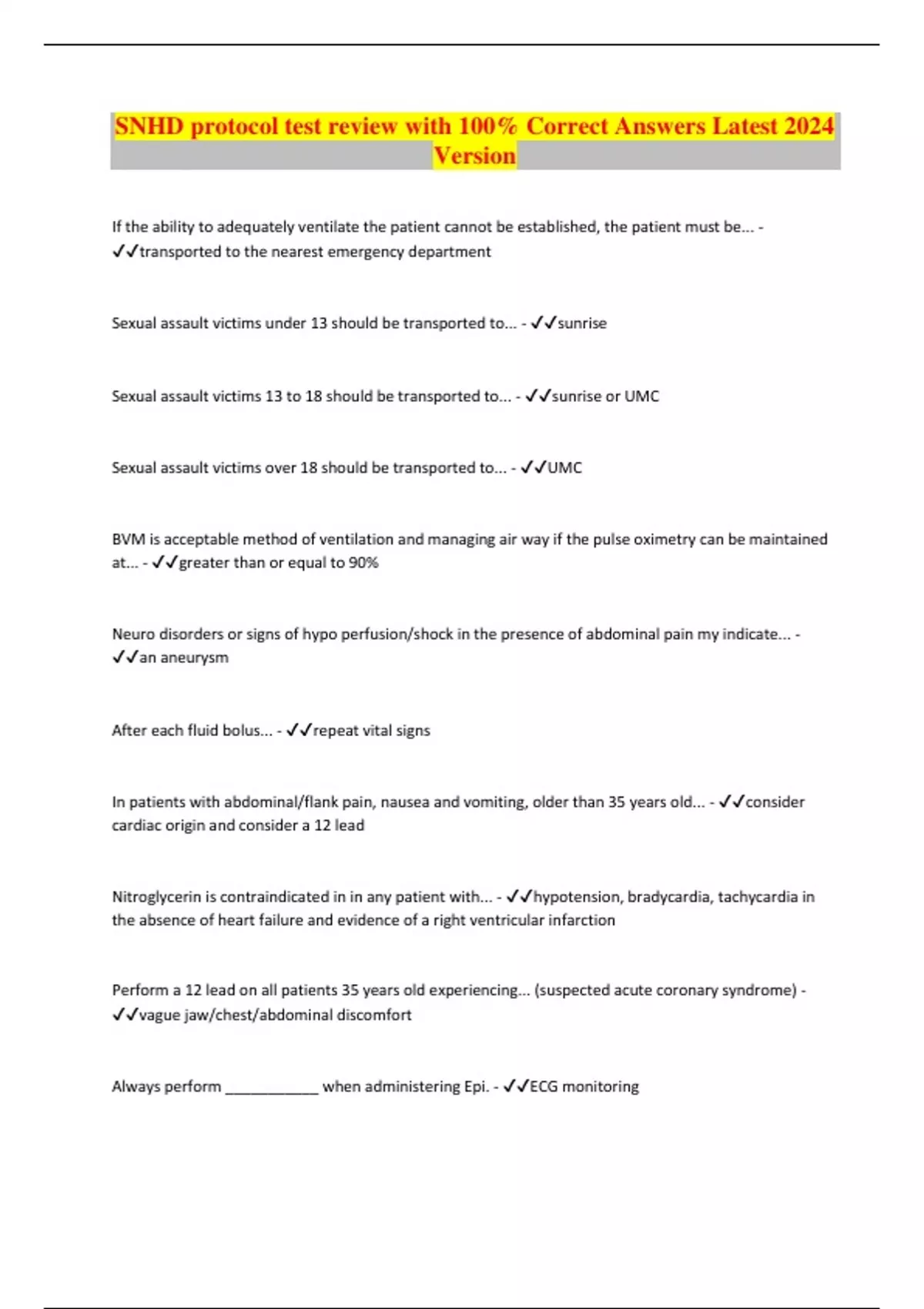 SNHD protocol test review with 100% Correct Answers Latest 2024 Version If the ability to adequately ventilate the patient cannot be established, the patient must be... - transported to the nearest emergency department Sexual assault victims under 13 should be transported to... - sunrise Sexual assault victims 13 to 18 should be transported to... - sunrise or UMC Sexual assault victims over 18 should be transported to... - UMC BVM is acceptable method of ventilation and managing air way if the pulse oximetry can be maintained at... - greater than or equal to 90% Neuro disorders or signs of hypo perfusion/shock in the presence of abdominal pain my indicate... - an aneurysm After each fluid bolus... - repeat vital signs In patients with abdominal/flank pain, nausea and vomiting, older than 35 years old... - consider cardiac origin and consider a 12 lead Nitroglycerin is contraindicated in in any patient with... - hypotension, bradycardia, tachycardia in the absence of heart failure and evidence of a right ventricular infarction Perform a 12 lead on all patients 35 years old experiencing... (suspected acute coronary syndrome) - vague jaw/chest/abdominal discomfort Always perform ___________ when administering Epi. - ECG monitoring