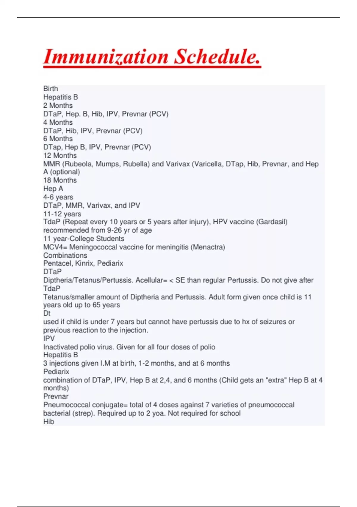 Birth Hepatitis B 2 Months DTaP, Hep. B, Hib, IPV, Prevnar (PCV) 4 Months DTaP, Hib, IPV, Prevnar (PCV) 6 Months DTap, Hep B, IPV, Prevnar (PCV) 12 Months MMR (Rubeola, Mumps, Rubella) and Varivax (Varicella, DTap, Hib, Prevnar, and Hep A (optional) 18 Months Hep A 4-6 years DTaP, MMR