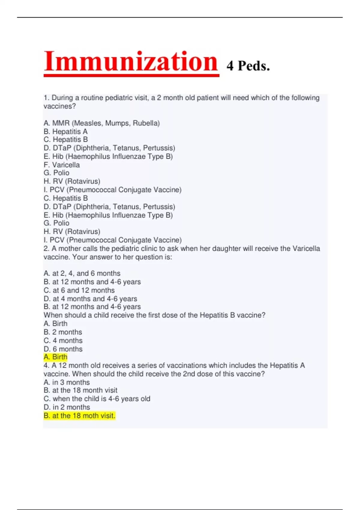 A. at 2, 4, and 6 months B. at 12 months and 4-6 years C. at 6 and 12 months D. at 4 months and 4-6 years B. at 12 months and 4-6 years When should a child receive the first dose of the Hepatitis B vaccine? A. Birth B. 2 months C. 4 months D. 6 months A. Birth 4. A 12 month old receives a series of vaccinations which includes the Hepatitis A vaccine. When should the child receive the 2nd dose of this vaccine? A. in 3 months B. at the 18 month visit C. when the child is 4-6 years old D. in 2 months B. at the 18 moth visit.