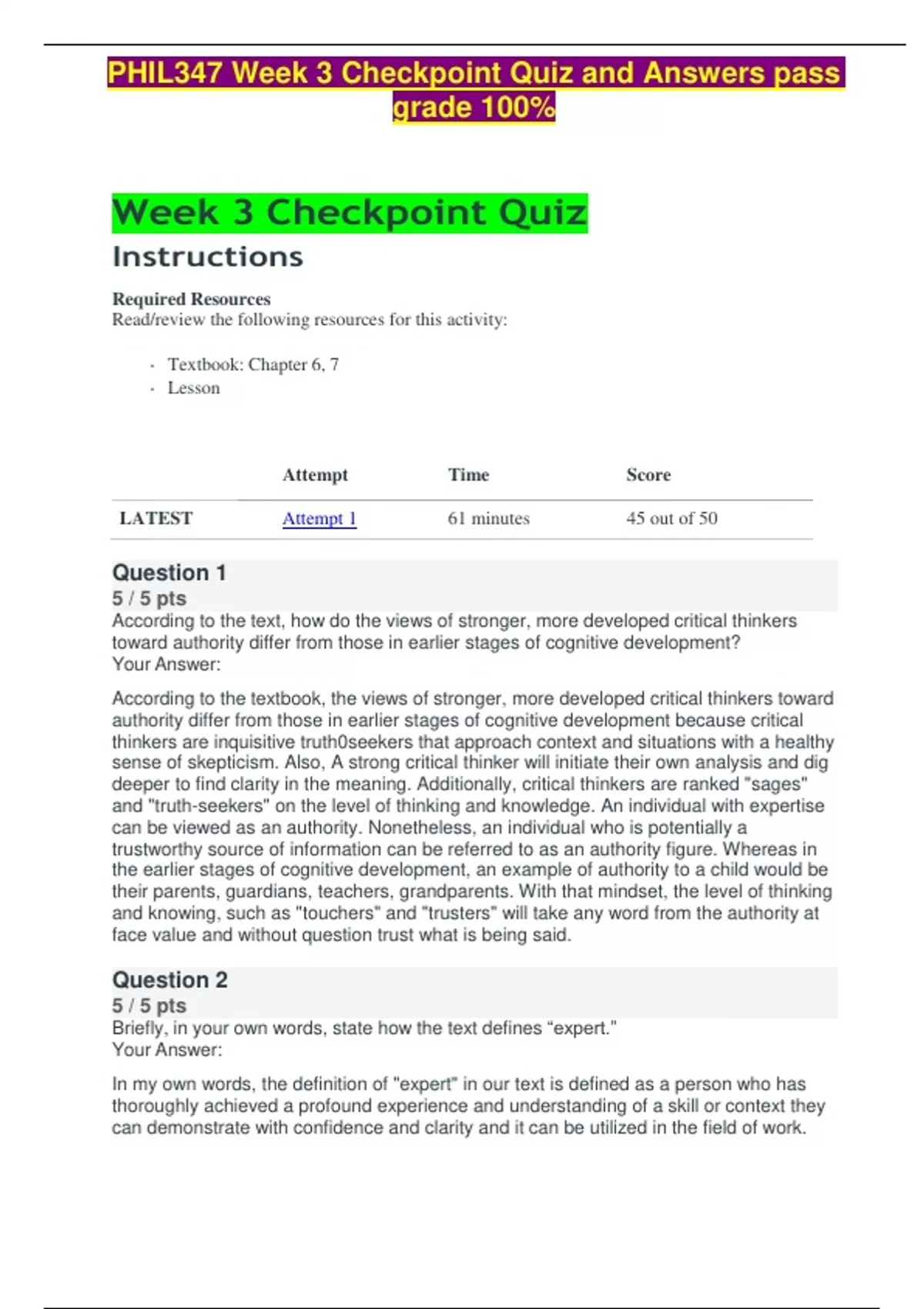 PHIL347 Week 3 Checkpoint Quiz and Answers pass grade 100%