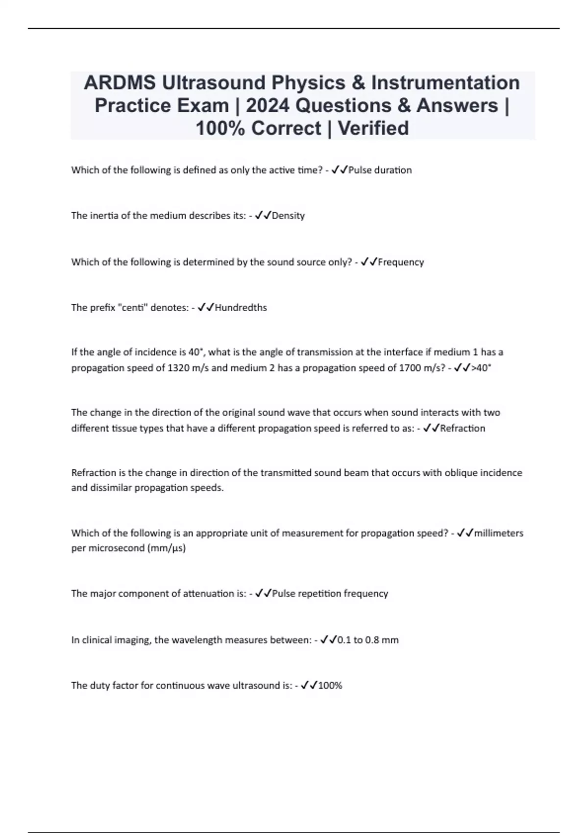 Which of the following is defined as only the active time? - Pulse duration The inertia of the medium describes its: - Density Which of the following is determined by the sound source only? - Frequency The prefix "centi" denotes: - Hundredths If the angle of incidence is 40°, what is the angle of transmission at the interface if medium 1 has a propagation speed of 1320 m/s and medium 2 has a propagation speed of 1700 m/s? - >40° The change in the direction of the original sound wave that occurs when sound interacts with two different tissue types that have a different propagation speed is referred to as: - Refraction Refraction is the change in direction of the transmitted sound beam that occurs with oblique incidence and dissimilar propagation speeds.