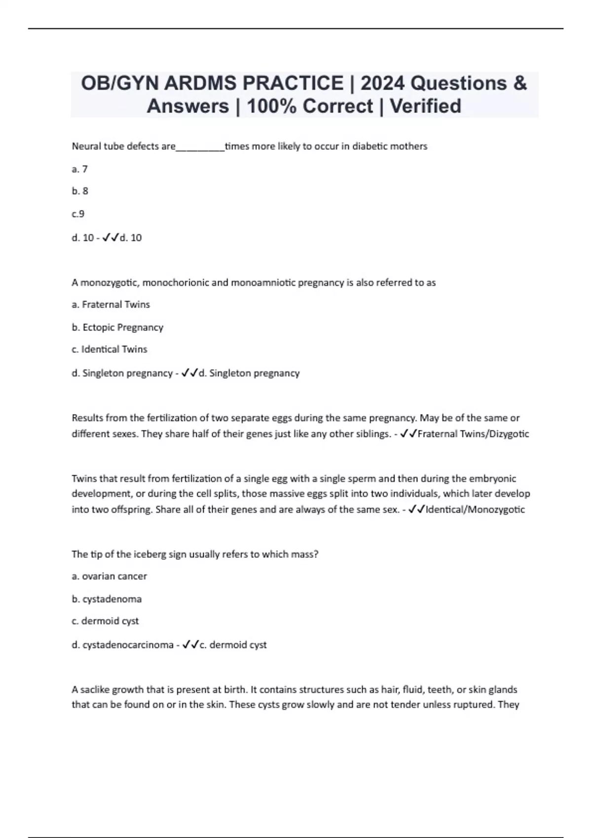 OB/GYN ARDMS PRACTICE | 2024 Questions & Answers | 100% Correct | Verified