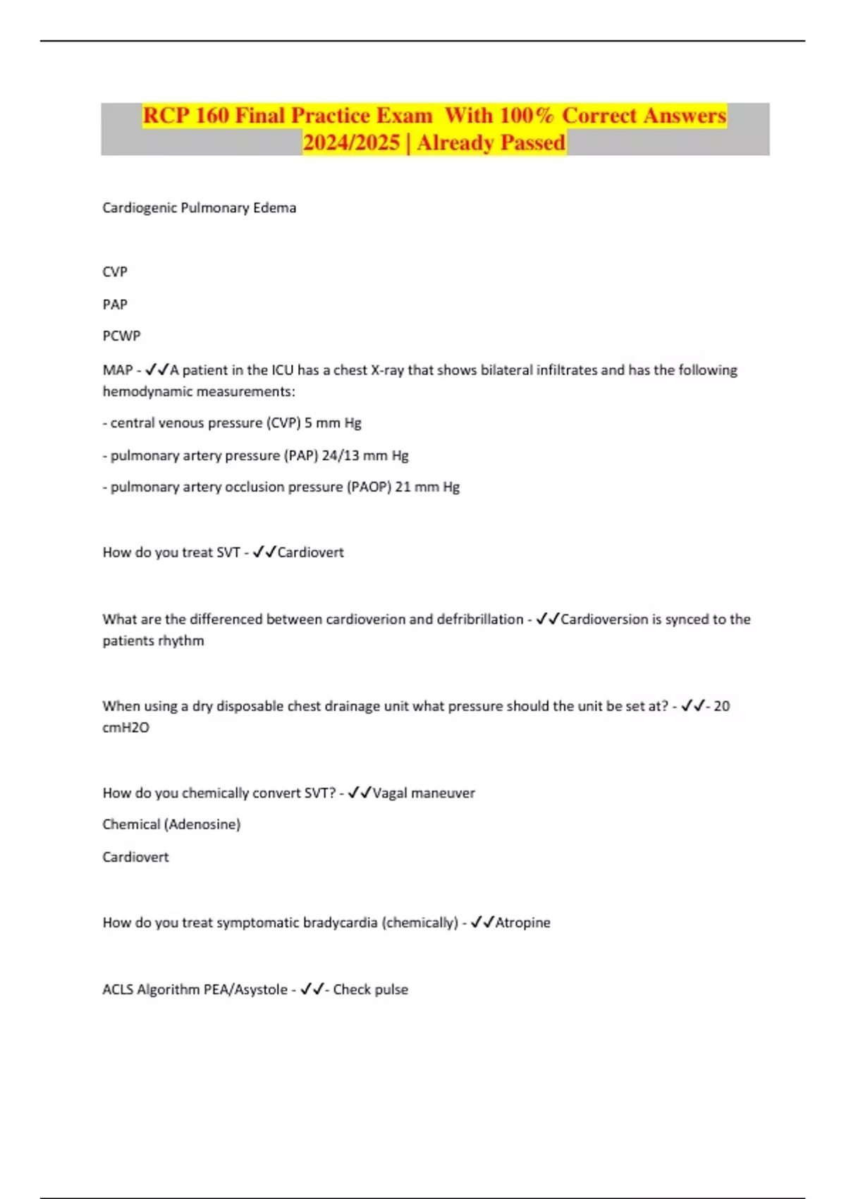 RCP 160 Final Practice Exam With 100% Correct Answers 2024/2025 | Already Passed Cardiogenic Pulmonary Edema CVP PAP PCWP MAP - A patient in the ICU has a chest X-ray that shows bilateral infiltrates and has the following hemodynamic measurements: - central venous pressure (CVP) 5 mm Hg - pulmonary artery pressure (PAP) 24/13 mm Hg - pulmonary artery occlusion pressure (PAOP) 21 mm Hg How do you treat SVT - Cardiovert What are the differenced between cardioverion and defribrillation - Cardioversion is synced to the patients rhythm When using a dry disposable chest drainage unit what pressure should the unit be set at? - - 20 cmH2O How do you chemically convert SVT? - Vagal maneuver Chemical (Adenosine) Cardiovert