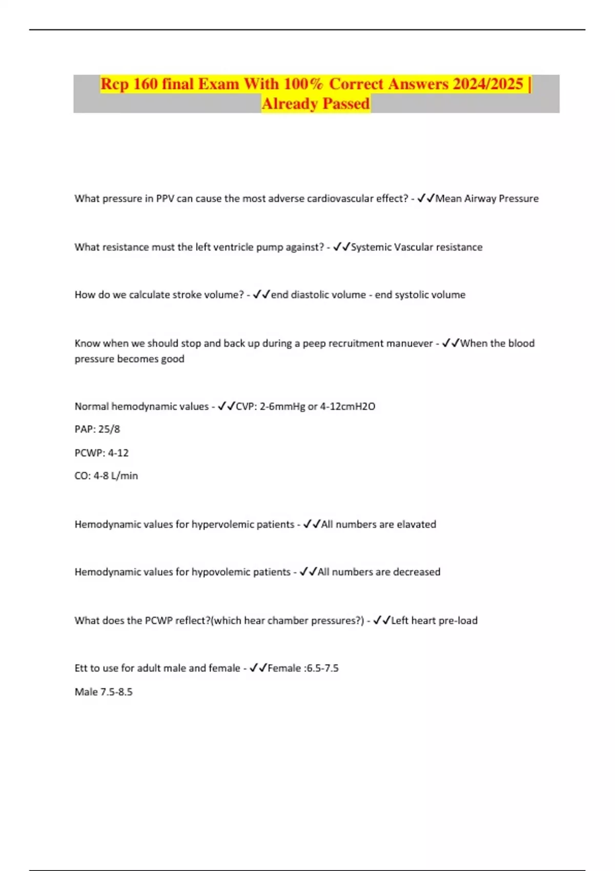 Rcp 160 final Exam With 100% Correct Answers 2024/2025 | Already Passed What pressure in PPV can cause the most adverse cardiovascular effect? - Mean Airway Pressure What resistance must the left ventricle pump against? - Systemic Vascular resistance How do we calculate stroke volume? - end diastolic volume - end systolic volume Know when we should stop and back up during a peep recruitment manuever - When the blood pressure becomes good Normal hemodynamic values - CVP: 2-6mmHg or 4-12cmH2O PAP: 25/8 PCWP: 4-12 CO: 4-8 L/min Hemodynamic values for hypervolemic patients - All numbers are elavated Hemodynamic values for hypovolemic patients - All numbers are decreased What does the PCWP reflect?(which hear chamber pressures?) - Left heart pre-load Ett to use for adult male and female - Female :6.5-7.5 Male 7.5-8.5