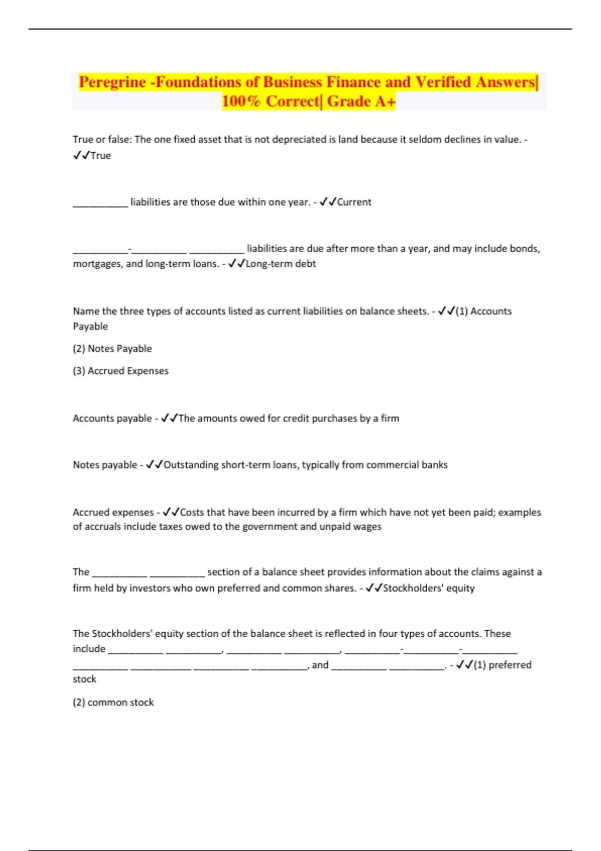 Peregrine -Foundations of Business Finance and Verified Answers| 100% Correct| Grade A+ True or false: The one fixed asset that is not depreciated is land because it seldom declines in value. - True __________ liabilities are those due within one year. - Current __________-__________ __________ liabilities are due after more than a year, and may include bonds, mortgages, and long-term loans. - Long-term debt Name the three types of accounts listed as current liabilities on balance sheets. - (1) Accounts Payable (2) Notes Payable (3) Accrued Expenses Accounts payable - The amounts owed for credit purchases by a firm Notes payable - Outstanding short-term loans, typically from commercial banks Accrued expenses - Costs that have been incurred by a firm which have not yet been paid; examples of accruals include taxes owed to the government and unpaid wages