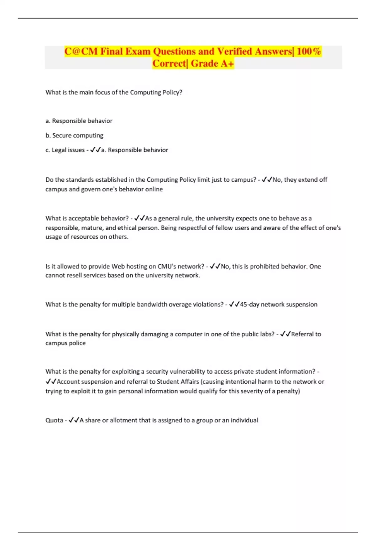 C@CM Final Exam Questions and Verified Answers| 100% Correct| Grade A+ What is the main focus of the Computing Policy? a. Responsible behavior b. Secure computing c. Legal issues - a. Responsible behavior Do the standards established in the Computing Policy limit just to campus? - No, they extend off campus and govern one's behavior online What is acceptable behavior? - As a general rule, the university expects one to behave as a responsible, mature, and ethical person. Being respectful of fellow users and aware of the effect of one's usage of resources on others. Is it allowed to provide Web hosting on CMU's network? - No, this is prohibited behavior. One cannot resell services based on the university network. What is the penalty for multiple bandwidth overage violations? - 45-day network suspension What is the penalty for physically damaging a computer in one of the public labs? - Referral to campus police What is the penalty for exploiting a security vulnerability to access private student information? - Account suspension and referral to Student Affairs (causing intentional harm to the network or trying to exploit it to gain personal information would qualify for this severity of a penalty)
