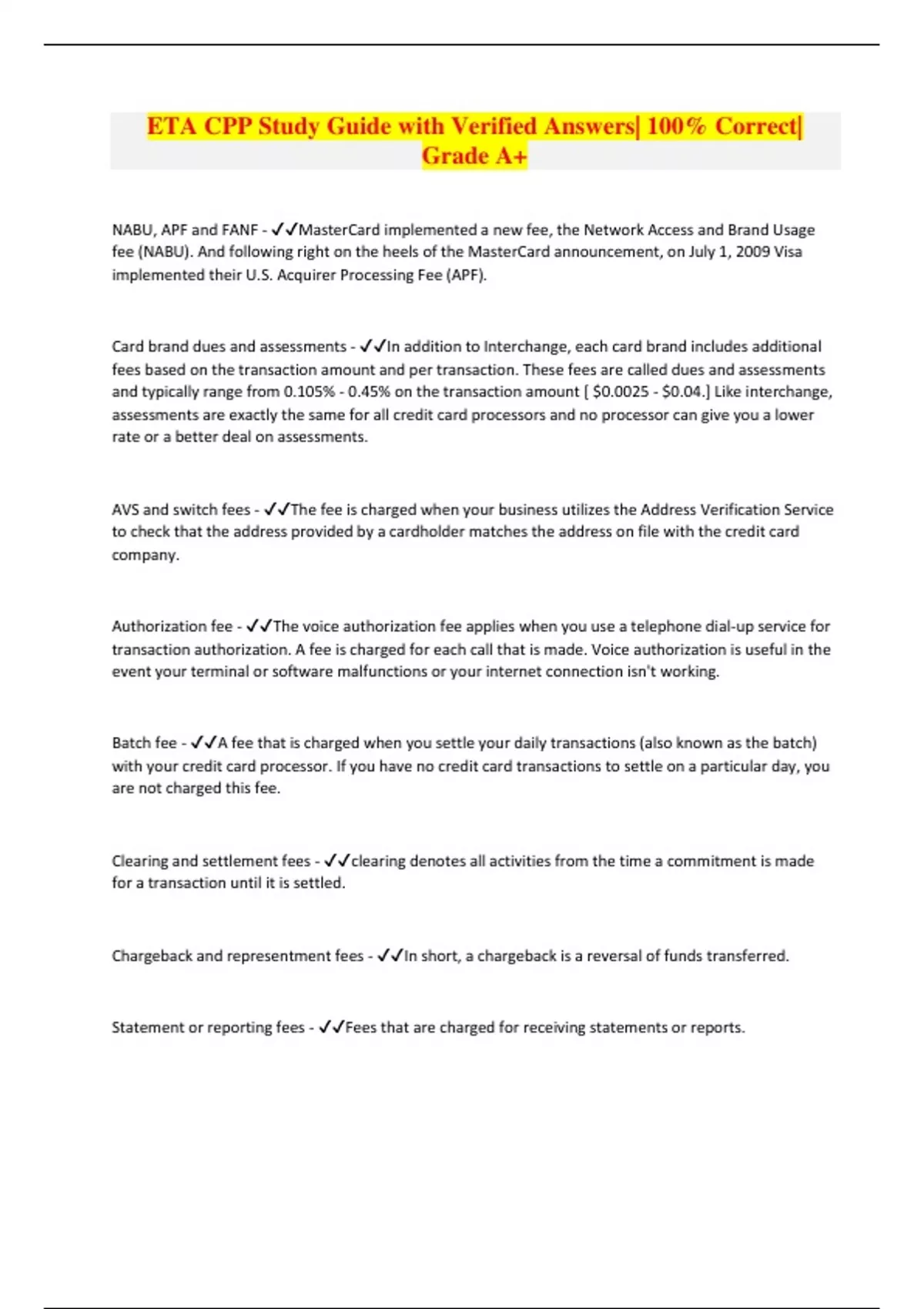 ETA CPP Study Guide with Verified Answers| 100% Correct| Grade A+ NABU, APF and FANF - MasterCard implemented a new fee, the Network Access and Brand Usage fee (NABU). And following right on the heels of the MasterCard announcement, on July 1, 2009 Visa implemented their U.S. Acquirer Processing Fee (APF). Card brand dues and assessments - In addition to Interchange, each card brand includes additional fees based on the transaction amount and per transaction. These fees are called dues and assessments and typically range from 0.105% - 0.45% on the transaction amount [ $0.0025 - $0.04.] Like interchange, assessments are exactly the same for all credit card processors and no processor can give you a lower rate or a better deal on assessments. AVS and switch fees - The fee is charged when your business utilizes the Address Verification Service to check that the address provided by a cardholder matches the address on file with the credit card company. Authorization fee - The voice authorization fee applies when you use a telephone dial-up service for transaction authorization. A fee is charged for each call that is made. Voice authorization is useful in the event your terminal or software malfunctions or your internet connection isn't working. Batch fee - A fee that is charged when you settle your daily transactions (also known as the batch) with your credit card processor. If you have no credit card transactions to settle on a particular day, you are not charged this fee. Clearing and settlement fees - clearing denotes all activities from the time a commitment is made for a transaction until it is settled.