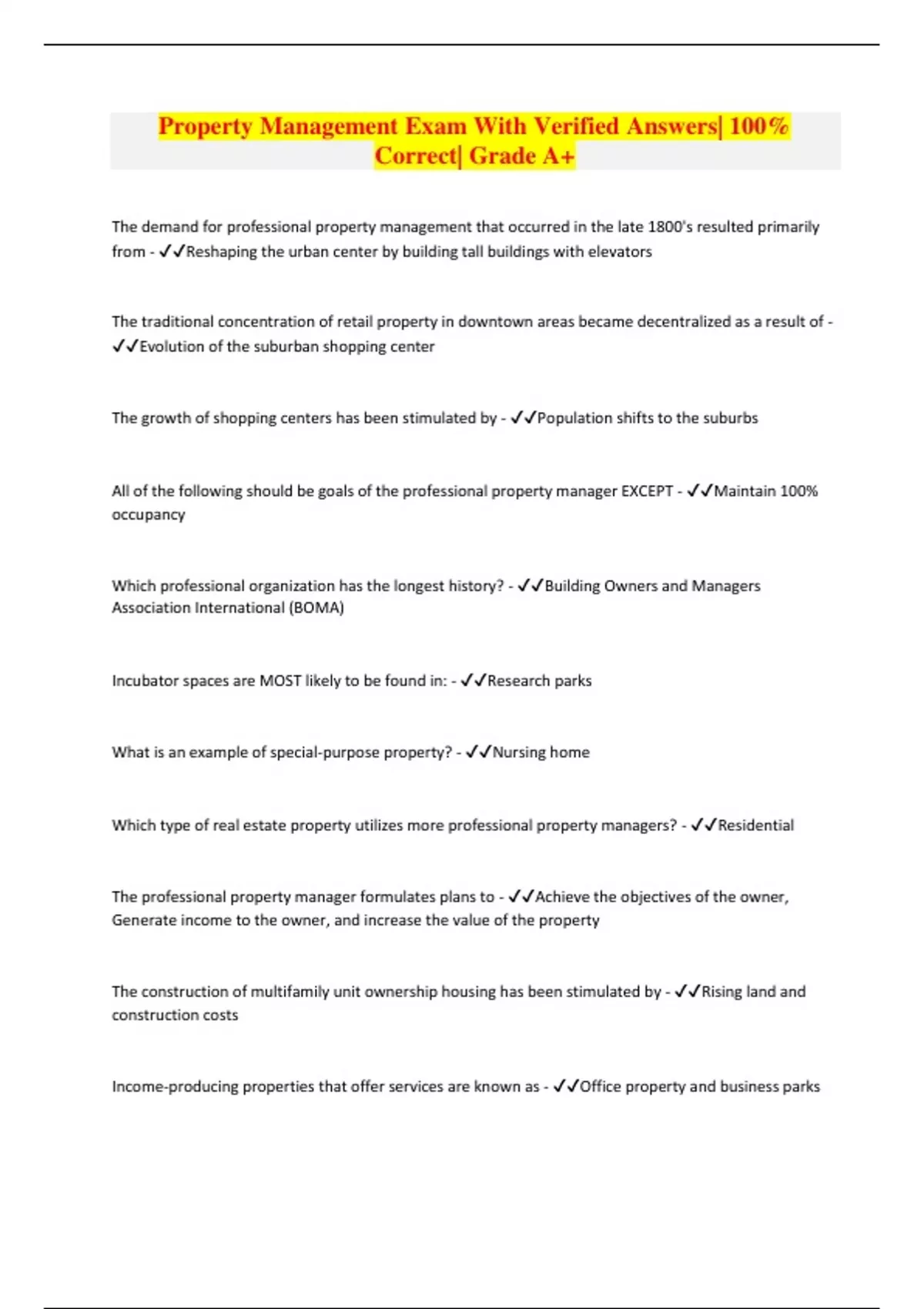 Property Management Exam With Verified Answers| 100% Correct| Grade A+ The demand for professional property management that occurred in the late 1800's resulted primarily from - Reshaping the urban center by building tall buildings with elevators The traditional concentration of retail property in downtown areas became decentralized as a result of - Evolution of the suburban shopping center The growth of shopping centers has been stimulated by - Population shifts to the suburbs All of the following should be goals of the professional property manager EXCEPT - Maintain 100% occupancy Which professional organization has the longest history? - Building Owners and Managers Association International (BOMA) Incubator spaces are MOST likely to be found in: - Research parks What is an example of special-purpose property? - Nursing home Which type of real estate property utilizes more professional property managers? - Residential The professional property manager formulates plans to - Achieve the objectives of the owner, Generate income to the owner, and increase the value of the property The construction of multifamily unit ownership housing has been stimulated by - Rising land and construction costs Income-producing properties that offer services are known as - Office property and business parks