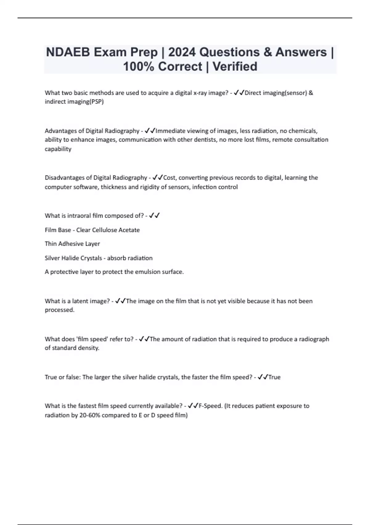 What two basic methods are used to acquire a digital x-ray image? - Direct imaging(sensor) & indirect imaging(PSP) Advantages of Digital Radiography - Immediate viewing of images, less radiation, no chemicals, ability to enhance images, communication with other dentists, no more lost films, remote consultation capability Disadvantages of Digital Radiography - Cost, converting previous records to digital, learning the computer software, thickness and rigidity of sensors, infection control What is intraoral film composed of? - Film Base - Clear Cellulose Acetate Thin Adhesive Layer Silver Halide Crystals - absorb radiation A protective layer to protect the emulsion surface