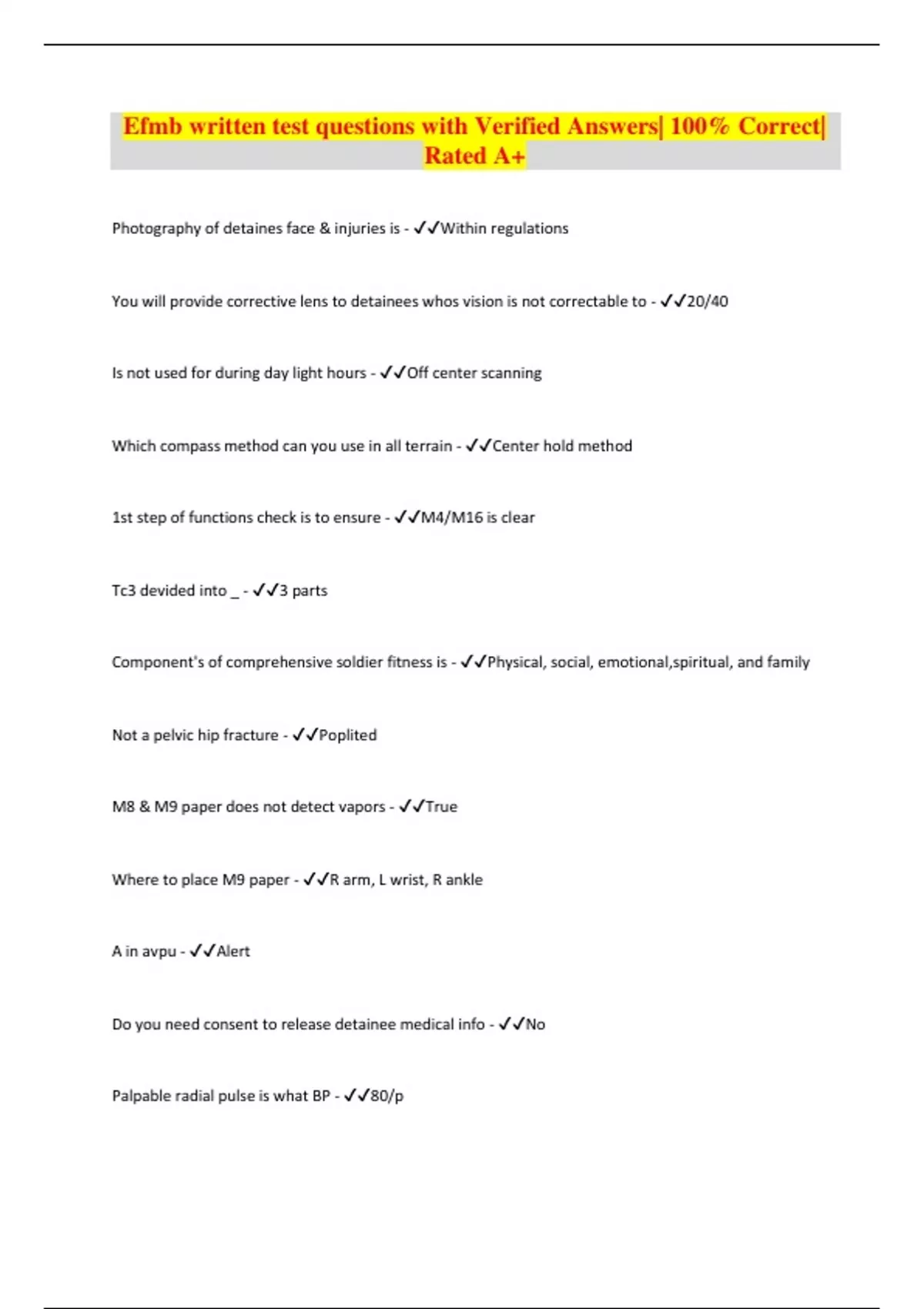 Efmb written test questions with Verified Answers| 100% Correct| Rated A+ Photography of detaines face & injuries is - Within regulations You will provide corrective lens to detainees whos vision is not correctable to - 20/40 Is not used for during day light hours - Off center scanning Which compass method can you use in all terrain - Center hold method 1st step of functions check is to ensure - M4/M16 is clear Tc3 devided into _ - 3 parts Component's of comprehensive soldier fitness is - Physical, social, emotional,spiritual, and family Not a pelvic hip fracture - Poplited