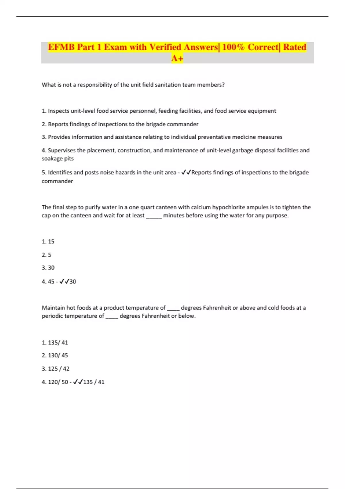 EFMB Part 1 Exam with Verified Answers| 100% Correct| Rated A+ What is not a responsibility of the unit field sanitation team members? 1. Inspects unit-level food service personnel, feeding facilities, and food service equipment 2. Reports findings of inspections to the brigade commander 3. Provides information and assistance relating to individual preventative medicine measures 4. Supervises the placement, construction, and maintenance of unit-level garbage disposal facilities and soakage pits 5. Identifies and posts noise hazards in the unit area - Reports findings of inspections to the brigade commander The final step to purify water in a one quart canteen with calcium hypochlorite ampules is to tighten the cap on the canteen and wait for at least _____ minutes before using the water for any purpose. 1. 15 2. 5 3. 30 4. 45 - 30