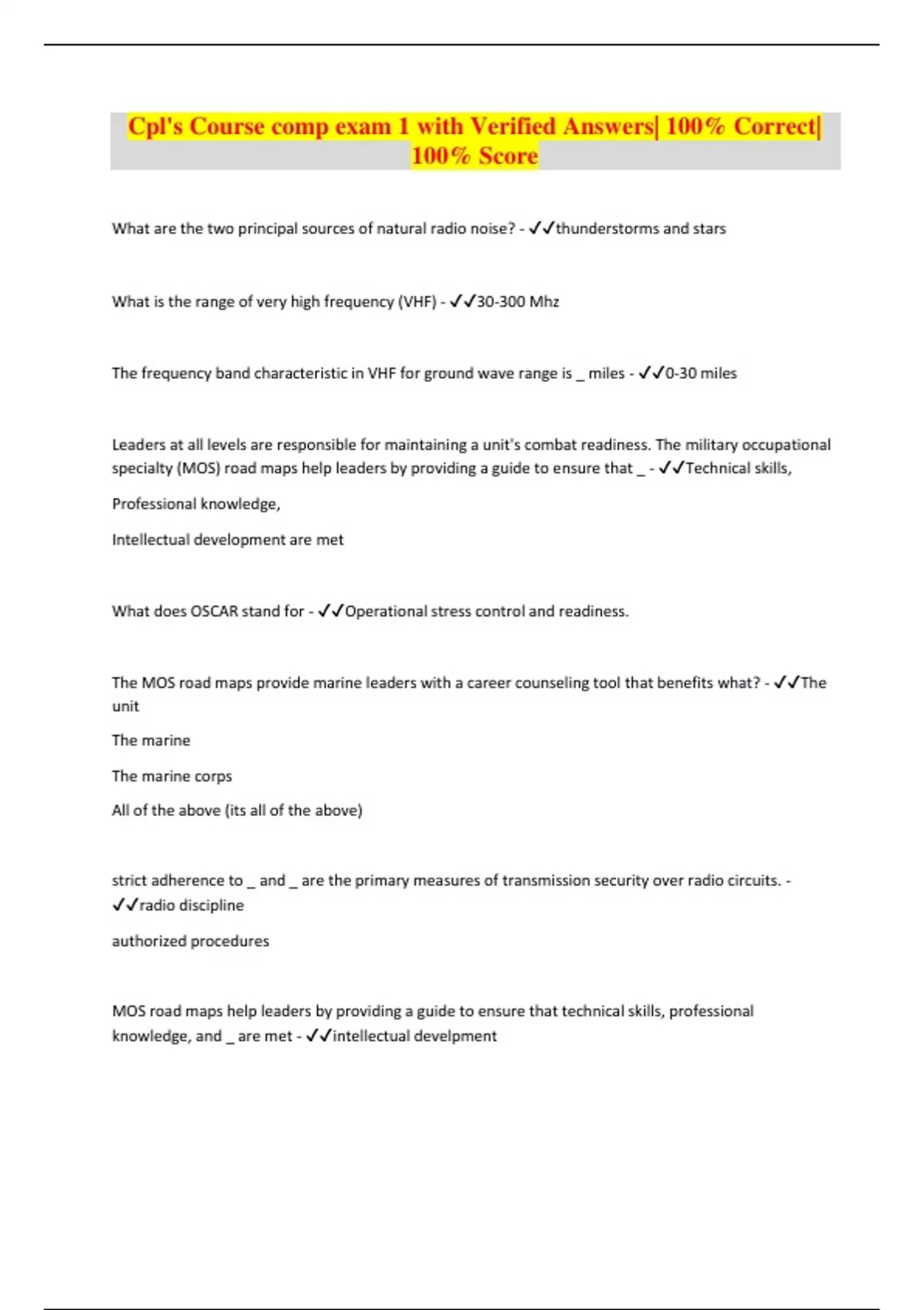 Cpl's Course comp exam 1 with Verified Answers| 100% Correct| 100% Score What are the two principal sources of natural radio noise? - thunderstorms and stars What is the range of very high frequency (VHF) - 30-300 Mhz The frequency band characteristic in VHF for ground wave range is _ miles - 0-30 miles Leaders at all levels are responsible for maintaining a unit's combat readiness. The military occupational specialty (MOS) road maps help leaders by providing a guide to ensure that _ - Technical skills, Professional knowledge, Intellectual development are met What does OSCAR stand for - Operational stress control and readiness. The MOS road maps provide marine leaders with a career counseling tool that benefits what? - The unit The marine The marine corps All of the above (its all of the above)