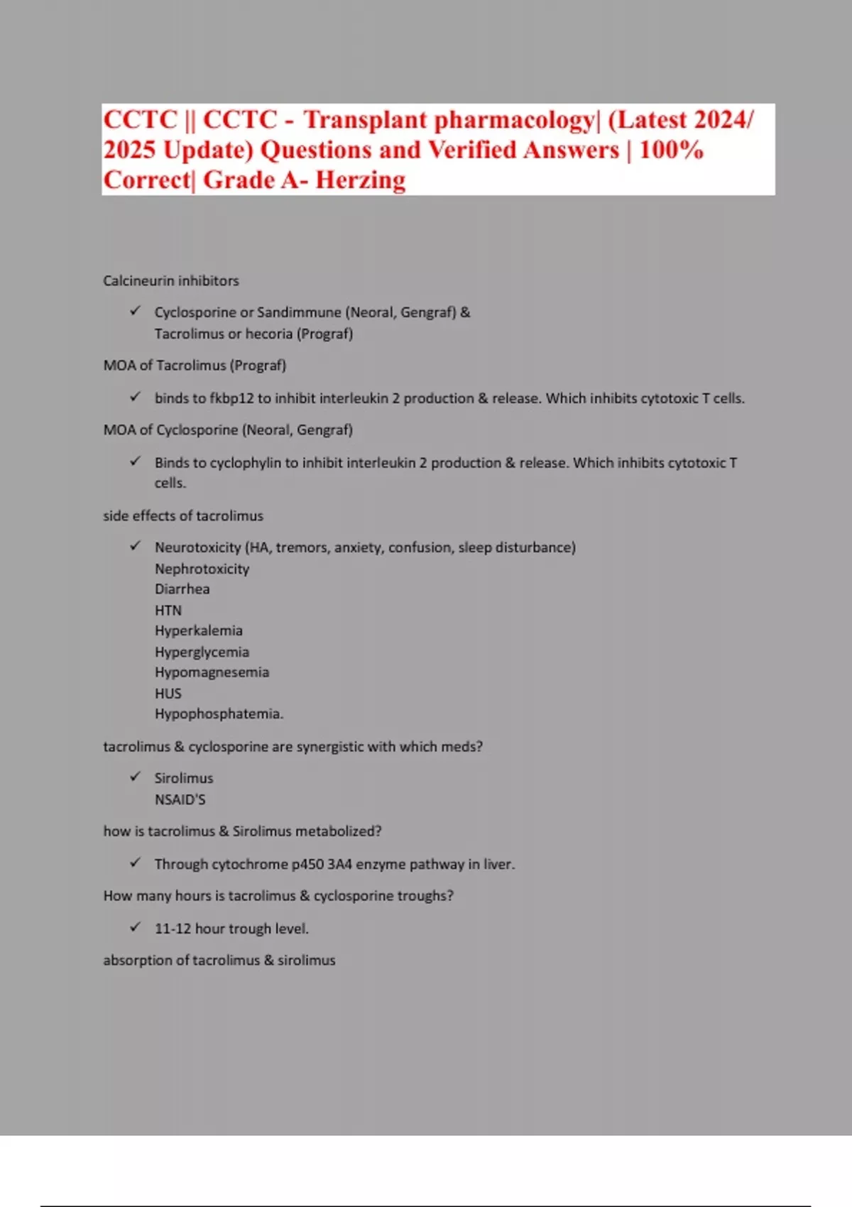 CCTC || CCTC - Transplant pharmacology| (Latest 2024/ 2025 Update) Questions and Verified Answers | 100% Correct| Grade A- Herzing