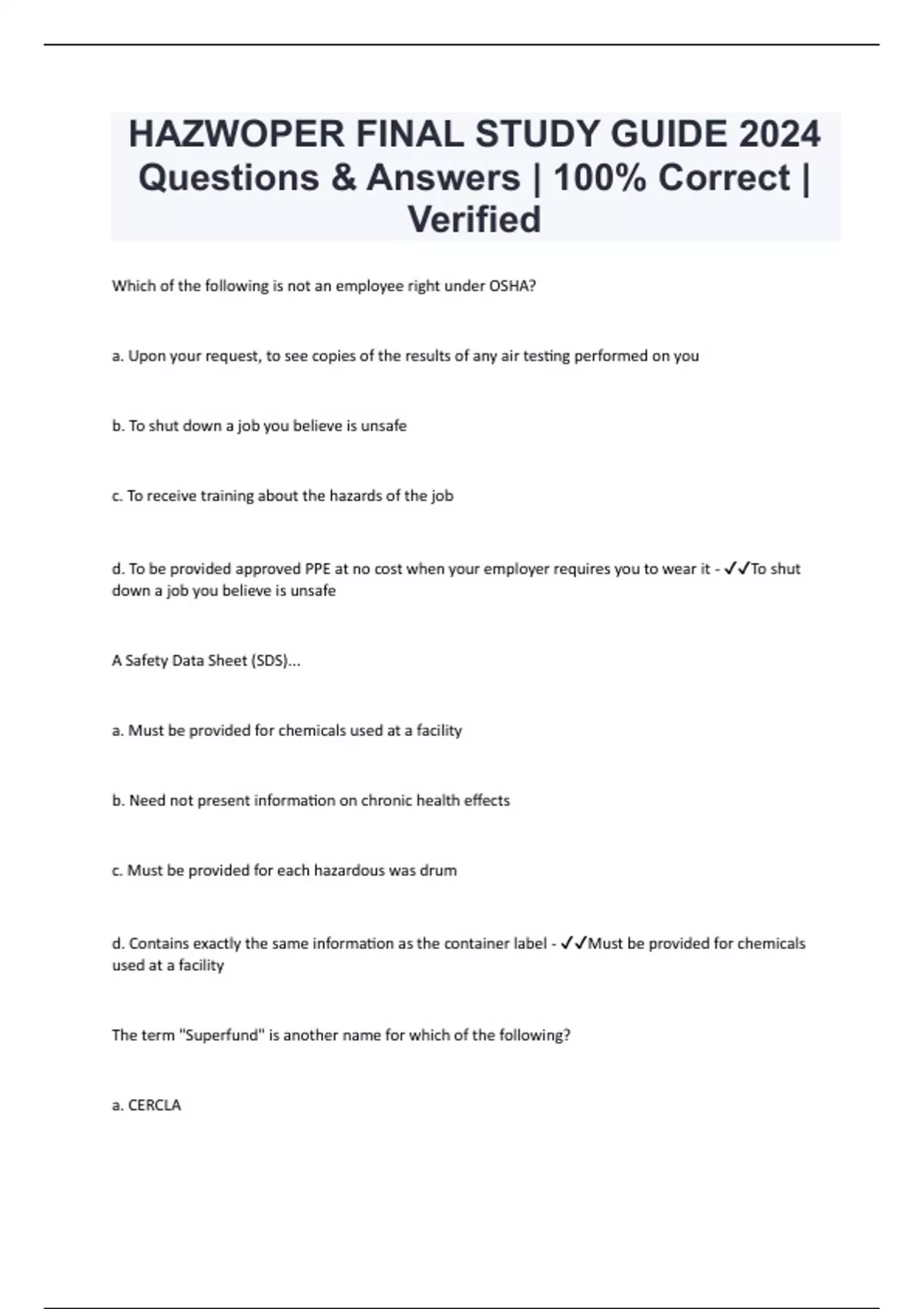Which of the following is not an employee right under OSHA? a. Upon your request, to see copies of the results of any air testing performed on you b. To shut down a job you believe is unsafe c. To receive training about the hazards of the job d. To be provided approved PPE at no cost when your employer requires you to wear it - To shut down a job you believe is unsafe A Safety Data Sheet (SDS)... a. Must be provided for chemicals used at a facility b. Need not present information on chronic health effects c. Must be provided for each hazardous was drum d. Contains exactly the same information as the container label - Must be provided for chemicals used at a facility