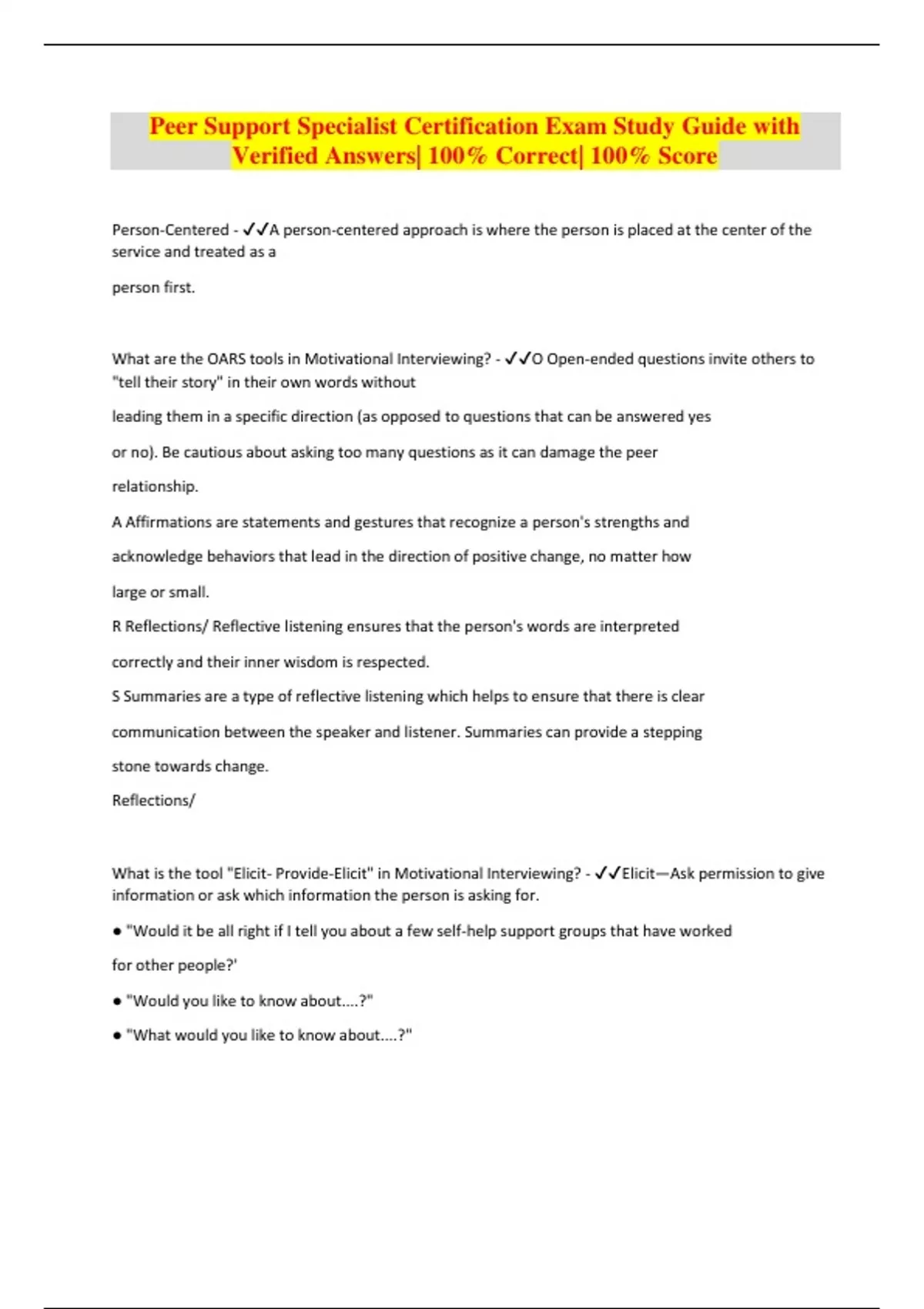 Peer Support Specialist Certification Exam Study Guide with Verified Answers| 100% Correct| 100% Score Person-Centered - A person-centered approach is where the person is placed at the center of the service and treated as a person first. What are the OARS tools in Motivational Interviewing? - O Open-ended questions invite others to "tell their story" in their own words without leading them in a specific direction (as opposed to questions that can be answered yes or no). Be cautious about asking too many questions as it can damage the peer relationship. A Affirmations are statements and gestures that recognize a person's strengths and acknowledge behaviors that lead in the direction of positive change, no matter how large or small. R Reflections/ Reflective listening ensures that the person's words are interpreted correctly and their inner wisdom is respected. S Summaries are a type of reflective listening which helps to ensure that there is clear communication between the speaker and listener. Summaries can provide a stepping stone towards change. Reflections/ What is the tool "Elicit- Provide-Elicit" in Motivational Interviewing? - Elicit—Ask permission to give information or ask which information the person is asking for. ● "Would it be all right if I tell you about a few self-help support groups that have worked for other people?' ● "Would you like to know about....?" ● "What would you like to know about....?