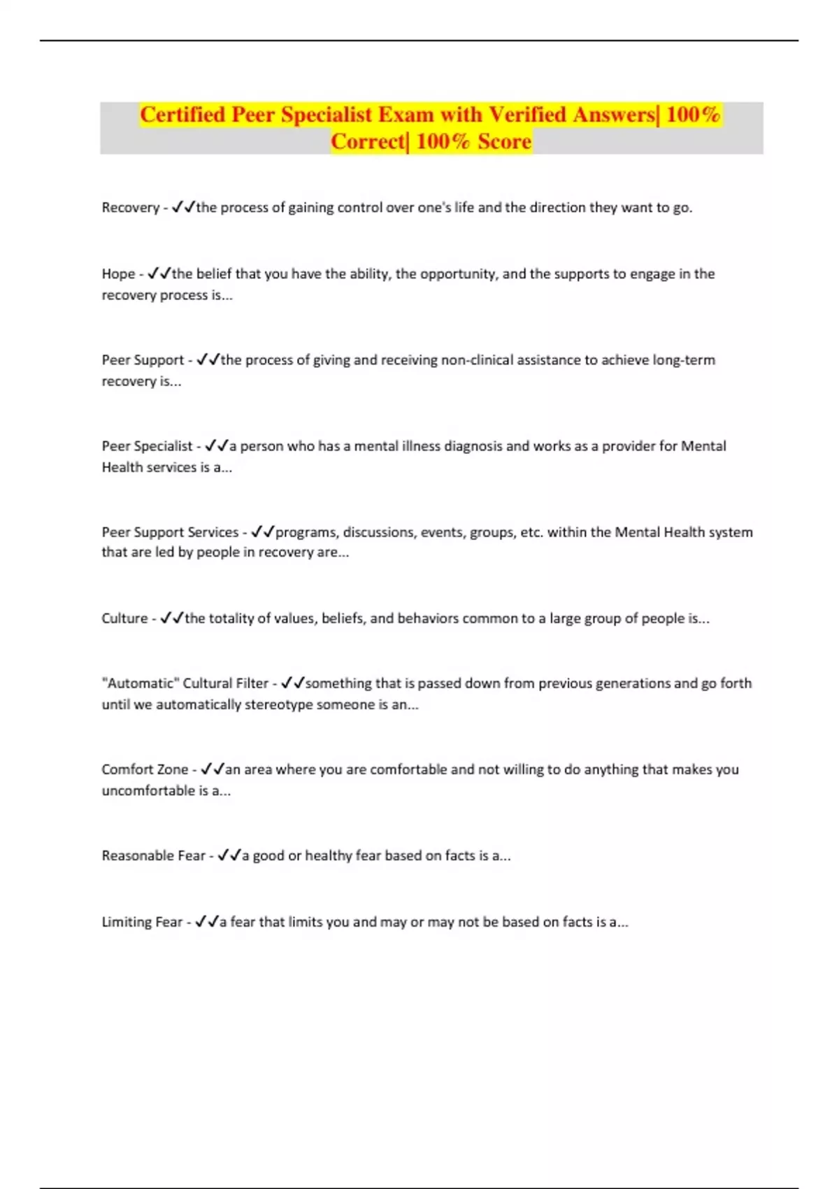 Certified Peer Specialist Exam with Verified Answers| 100% Correct| 100% Score Recovery - the process of gaining control over one's life and the direction they want to go. Hope - the belief that you have the ability, the opportunity, and the supports to engage in the recovery process is... Peer Support - the process of giving and receiving non-clinical assistance to achieve long-term recovery is... Peer Specialist - a person who has a mental illness diagnosis and works as a provider for Mental Health services is a... Peer Support Services - programs, discussions, events, groups, etc. within the Mental Health system that are led by people in recovery are... Culture - the totality of values, beliefs, and behaviors common to a large group of people is... "Automatic" Cultural Filter - something that is passed down from previous generations and go forth until we automatically stereotype someone is an... Comfort Zone - an area where you are comfortable and not willing to do anything that makes you uncomfortable is a... Reasonable Fear - a good or healthy fear based on facts is a... Limiting Fear - a fear that limits you and may or may not be based on facts is a..
