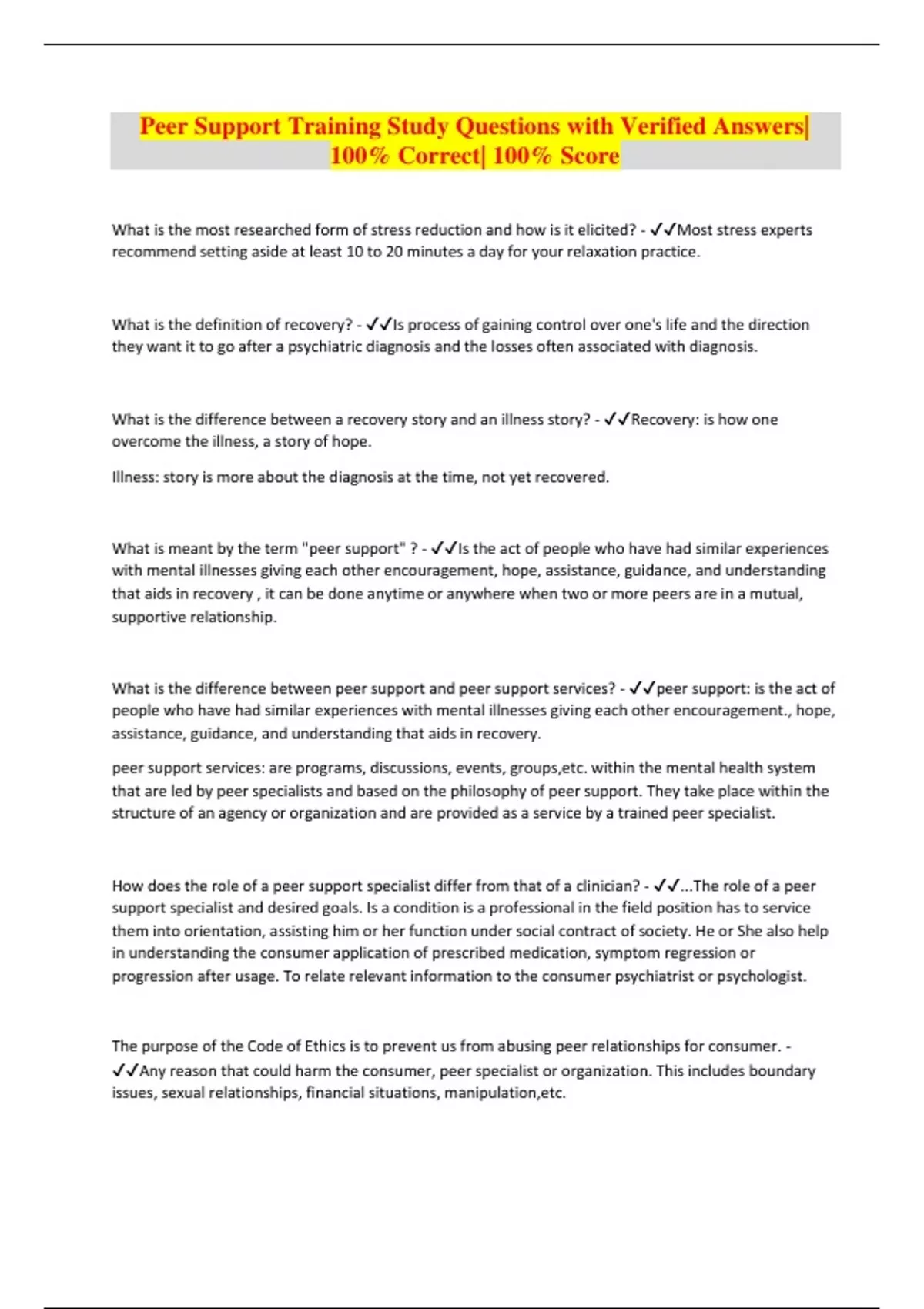 Peer Support Training Study Questions with Verified Answers| 100% Correct| 100% Score What is the most researched form of stress reduction and how is it elicited? - Most stress experts recommend setting aside at least 10 to 20 minutes a day for your relaxation practice. What is the definition of recovery? - Is process of gaining control over one's life and the direction they want it to go after a psychiatric diagnosis and the losses often associated with diagnosis. What is the difference between a recovery story and an illness story? - Recovery: is how one overcome the illness, a story of hope. Illness: story is more about the diagnosis at the time, not yet recovered. What is meant by the term "peer support" ? - Is the act of people who have had similar experiences with mental illnesses giving each other encouragement, hope, assistance, guidance, and understanding that aids in recovery , it can be done anytime or anywhere when two or more peers are in a mutual, supportive relationship. What is the difference between peer support and peer support services? - peer support: is the act of people who have had similar experiences with mental illnesses giving each other encouragement., hope, assistance, guidance, and understanding that aids in recovery. peer support services: are programs, discussions, events, groups,etc. within the mental health system that are led by peer specialists and based on the philosophy of peer support. They take place within the structure of an agency or organization and are provided as a service by a trained peer specialist.