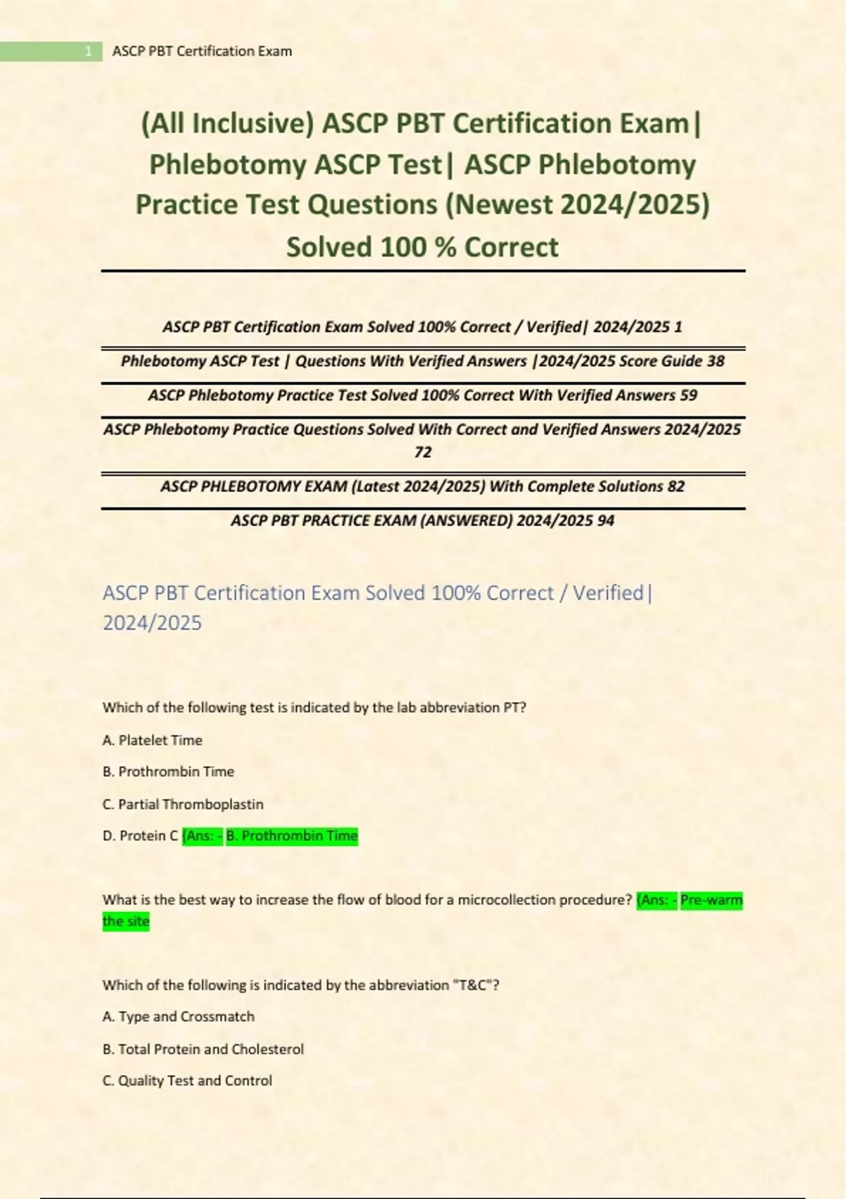 (All Inclusive) ASCP PBT Certification Exam| Phlebotomy ASCP Test| ASCP Phlebotomy Practice Test Questions (Newest 2024/2025) Solved 100 % Correct,(All Inclusive) ASCP PBT Certification Exam| Phlebotomy ASCP Test| ASCP Phlebotomy Practice Test Questions (Newest 2024/2025) Solved 100 % Correct