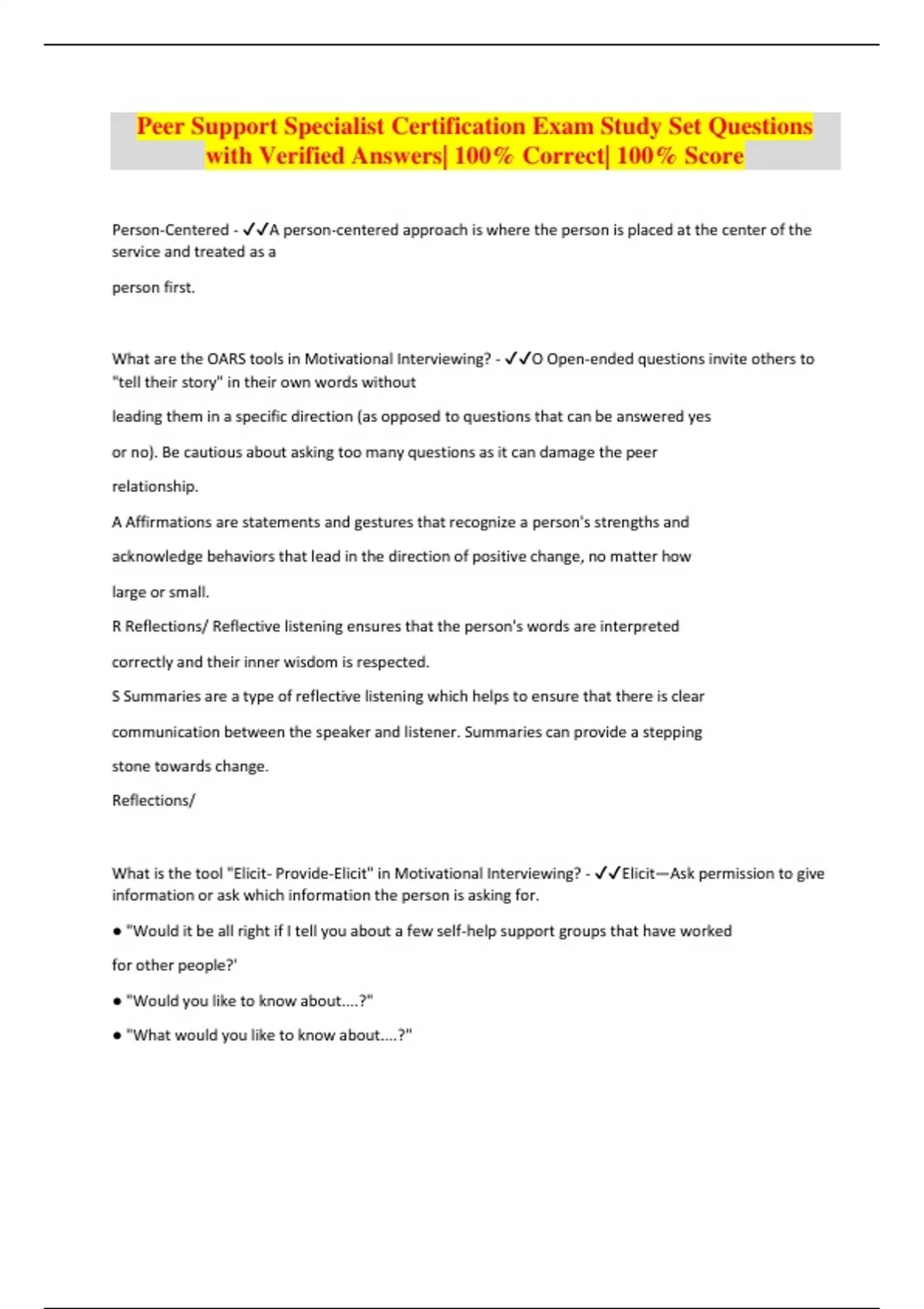 Peer Support Specialist Certification Exam Study Set Questions with Verified Answers| 100% Correct| 100% Score Person-Centered - A person-centered approach is where the person is placed at the center of the service and treated as a person first. What are the OARS tools in Motivational Interviewing? - O Open-ended questions invite others to "tell their story" in their own words without leading them in a specific direction (as opposed to questions that can be answered yes or no). Be cautious about asking too many questions as it can damage the peer relationship. A Affirmations are statements and gestures that recognize a person's strengths and acknowledge behaviors that lead in the direction of positive change, no matter how large or small. R Reflections/ Reflective listening ensures that the person's words are interpreted correctly and their inner wisdom is respected. S Summaries are a type of reflective listening which helps to ensure that there is clear communication between the speaker and listener. Summaries can provide a stepping stone towards change. Reflections/ What is the tool "Elicit- Provide-Elicit" in Motivational Interviewing? - Elicit—Ask permission to give information or ask which information the person is asking for. ● "Would it be all right if I tell you about a few self-help support groups that have worked for other people?' ● "Would you like to know about....?" ● "What would you like to know about....?"