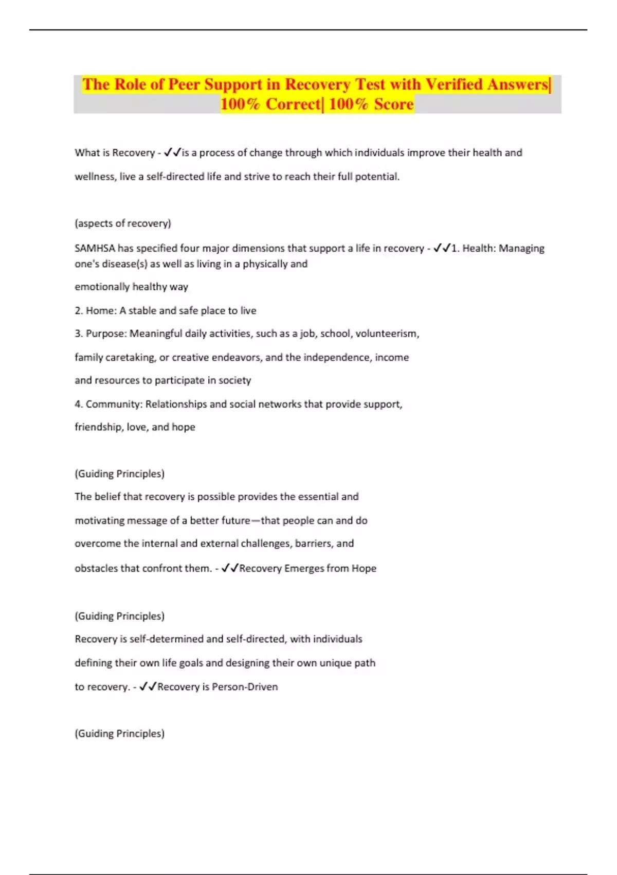 The Role of Peer Support in Recovery Test with Verified Answers| 100% Correct| 100% Score What is Recovery - is a process of change through which individuals improve their health and wellness, live a self-directed life and strive to reach their full potential. (aspects of recovery) SAMHSA has specified four major dimensions that support a life in recovery - 1. Health: Managing one's disease(s) as well as living in a physically and emotionally healthy way 2. Home: A stable and safe place to live 3. Purpose: Meaningful daily activities, such as a job, school, volunteerism, family caretaking, or creative endeavors, and the independence, income and resources to participate in society 4. Community: Relationships and social networks that provide support, friendship, love, and hope (Guiding Principles) The belief that recovery is possible provides the essential and motivating message of a better future—that people can and do overcome the internal and external challenges, barriers, and obstacles that confront them. - Recovery Emerges from Hope