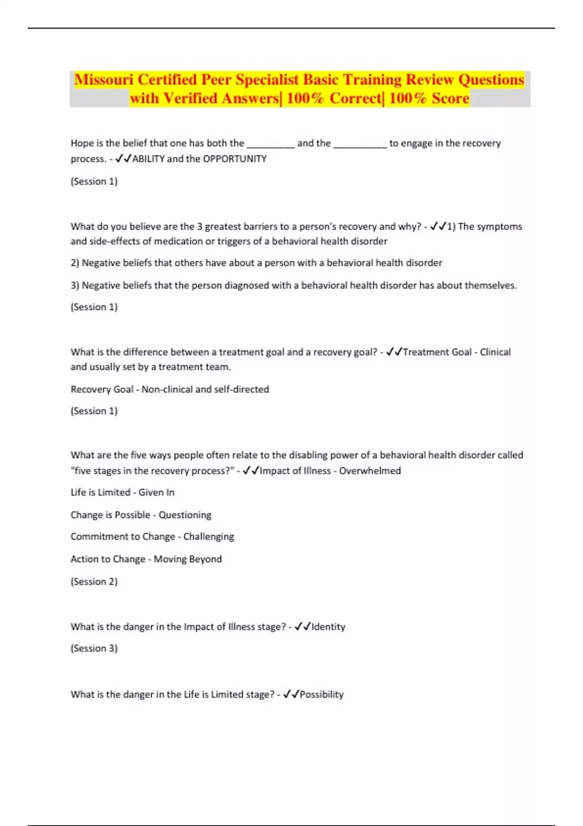 Missouri Certified Peer Specialist Basic Training Review Questions with Verified Answers| 100% Correct| 100% Score Hope is the belief that one has both the _________ and the __________ to engage in the recovery process. - ABILITY and the OPPORTUNITY (Session 1) What do you believe are the 3 greatest barriers to a person's recovery and why? - 1) The symptoms and side-effects of medication or triggers of a behavioral health disorder 2) Negative beliefs that others have about a person with a behavioral health disorder 3) Negative beliefs that the person diagnosed with a behavioral health disorder has about themselves. (Session 1) What is the difference between a treatment goal and a recovery goal? - Treatment Goal - Clinical and usually set by a treatment team. Recovery Goal - Non-clinical and self-directed (Session 1) What are the five ways people often relate to the disabling power of a behavioral health disorder called "five stages in the recovery process?" - Impact of Illness - Overwhelmed Life is Limited - Given In Change is Possible - Questioning Commitment to Change - Challenging Action to Change - Moving Beyond (Session 2) What is the danger in the Impact of Illness stage? - Identity (Session 3) What is the danger in the Life is Limited stage? - Possibility