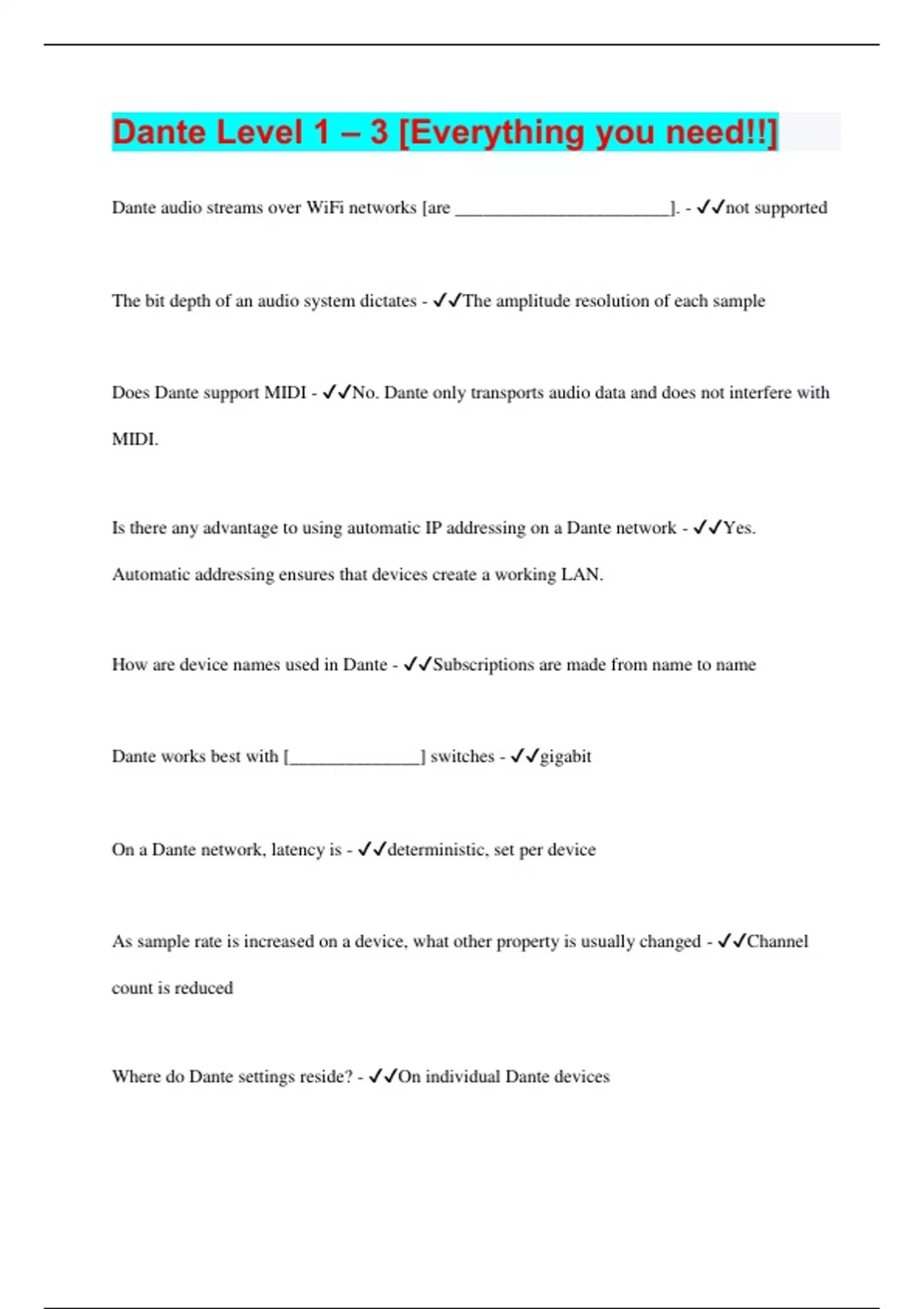 Dante Level 1 – 3 [Everything you need!!] Dante audio streams over WiFi networks [are _______________________]. - not supported The bit depth of an audio system dictates - The amplitude resolution of each sample Does Dante support MIDI - No. Dante only transports audio data and does not interfere with MIDI. Is there any advantage to using automatic IP addressing on a Dante network - Yes. Automatic addressing ensures that devices create a working LAN. How are device names used in Dante - Subscriptions are made from name to name Dante works best with [______________] switches - gigabit On a Dante network, latency is - deterministic, set per device As sample rate is increased on a device, what other property is usually changed - Channel count is reduced Where do Dante settings reside? - On individual Dante devices In the Dante Controller Routing tab, a green check mark indicates - Subscription successful Which of the following are diagnostic features of Dante Controller? (check all that apply) - 1. Latency monitoring 2. Clock monitoring How does Dante interact with Energy Efficient Ethernet (EEE) switches? - EEE switches are not recommended for use with Dante When should fiber be used for an Ethernet connection? - When runs over 100 meters are required. The easiest way to get IP addresses for a functional stand-alone Dante network is for all devices and computers to - Use the "obtain an IP Address Automatically" setting If a network is only used for Dante and has only one network switch, then - The network does not require a managed switch Does Dante require special network cabling? - Regular CAT5E or CAT6 Ethernet cable is recommended How are devices added to a Dante network - Devices are automatically discovered and displayed in Dante Controller Dante uses [_________________________] switches. - standard How are devices restored to a Dante network after power cycle - Devices and connections are automatically restored What does the Dante Clock Master do - Provides synchronization for all Dante devices on the network Does a Dante network require special configuration for clocking - No. A Clock Master is always automatically elected by Dante A[______________] network topology is a best practice for Dante. - star What is latency - Latency is the audio signal delay in any audio system. Dante transmitters are sources. Dante receivers are [______________________]. - destinations The names of devices and channels in Dante are - User-definable and remembered by devices. The default Dante latency of 1 millisecond is - very low and suitable for the majority of applications What are the steps to delete a subscription in Dante Controller? (drag to put steps in the correct order) - 1. Open both transmitter and receiver to expose channels 2. Click green checkmark at intersection