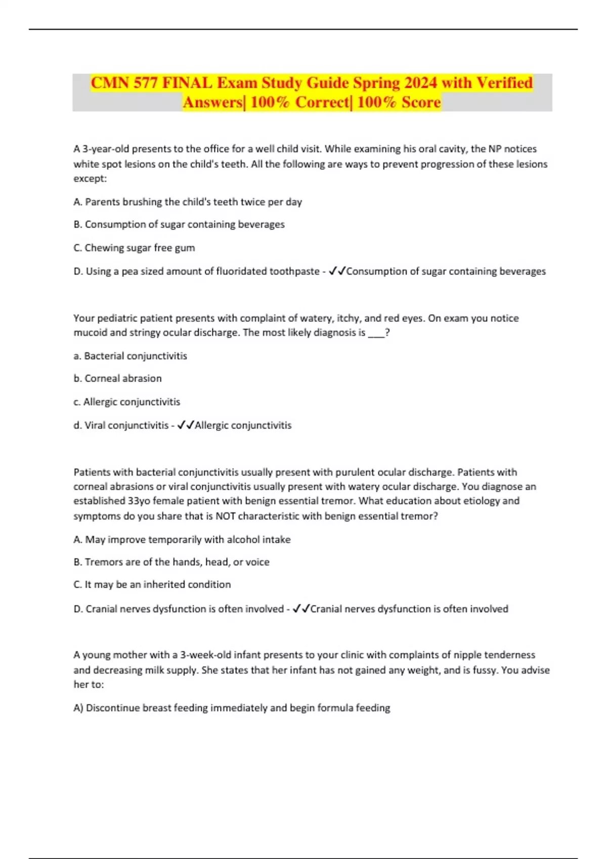 CMN 577 FINAL Exam Study Guide Spring 2024 with Verified Answers| 100% Correct| 100% Score A 3-year-old presents to the office for a well child visit. While examining his oral cavity, the NP notices white spot lesions on the child's teeth. All the following are ways to prevent progression of these lesions except: A. Parents brushing the child's teeth twice per day B. Consumption of sugar containing beverages C. Chewing sugar free gum D. Using a pea sized amount of fluoridated toothpaste - Consumption of sugar containing beverages Your pediatric patient presents with complaint of watery, itchy, and red eyes. On exam you notice mucoid and stringy ocular discharge. The most likely diagnosis is ___? a. Bacterial conjunctivitis b. Corneal abrasion c. Allergic conjunctivitis d. Viral conjunctivitis - Allergic conjunctivitis Patients with bacterial conjunctivitis usually present with purulent ocular discharge. Patients with corneal abrasions or viral conjunctivitis usually present with watery ocular discharge. You diagnose an established 33yo female patient with benign essential tremor. What education about etiology and symptoms do you share that is NOT characteristic with benign essential tremor? A. May improve temporarily with alcohol intake B. Tremors are of the hands, head, or voice C. It may be an inherited condition D. Cranial nerves dysfunction is often involved - Cranial nerves dysfunction is often involved