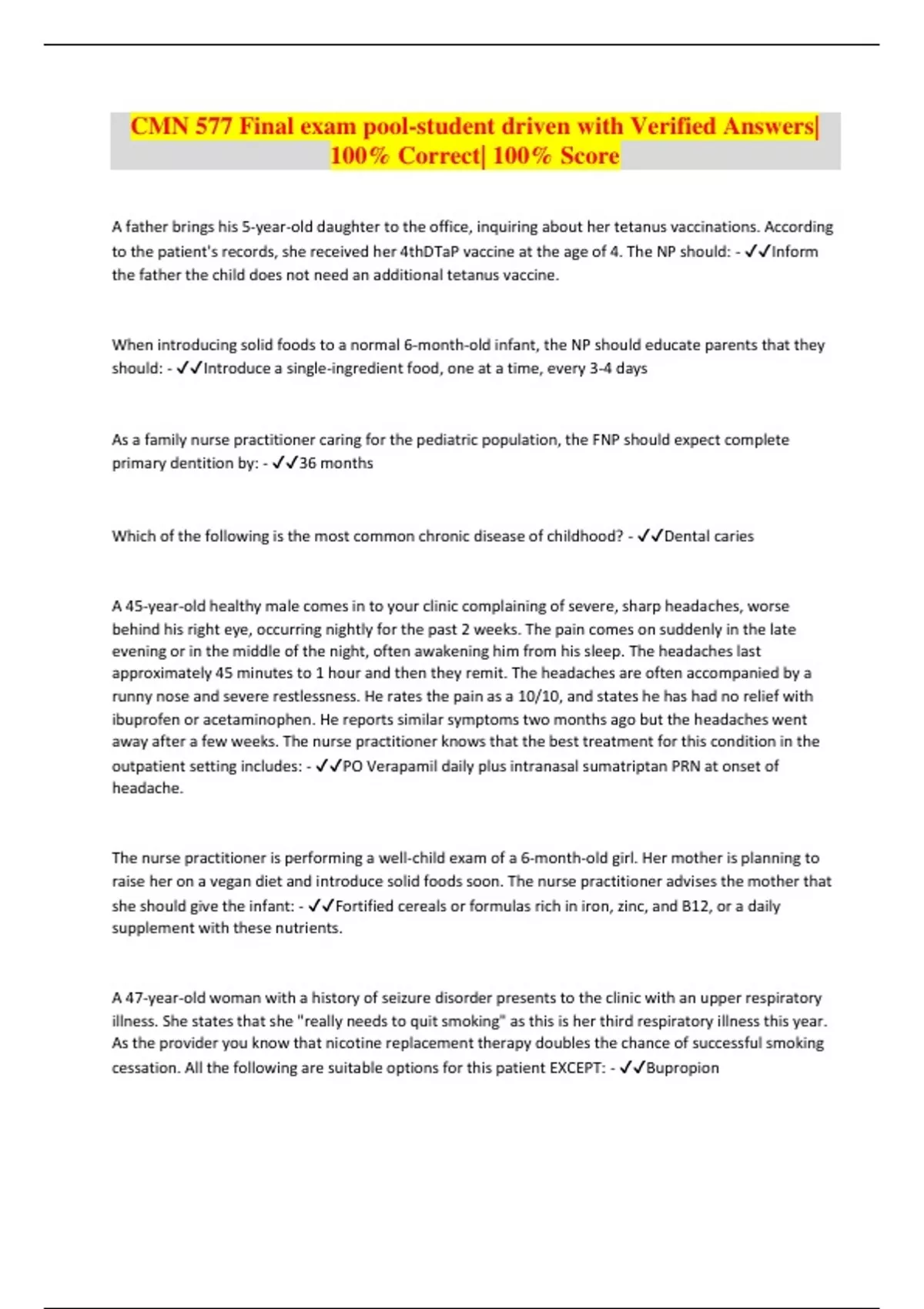 CMN 577 Final exam pool-student driven with Verified Answers| 100% Correct| 100% Score A father brings his 5-year-old daughter to the office, inquiring about her tetanus vaccinations. According to the patient's records, she received her 4thDTaP vaccine at the age of 4. The NP should: - Inform the father the child does not need an additional tetanus vaccine. When introducing solid foods to a normal 6-month-old infant, the NP should educate parents that they should: - Introduce a single-ingredient food, one at a time, every 3-4 days As a family nurse practitioner caring for the pediatric population, the FNP should expect complete primary dentition by: - 36 months Which of the following is the most common chronic disease of childhood? - Dental caries A 45-year-old healthy male comes in to your clinic complaining of severe, sharp headaches, worse behind his right eye, occurring nightly for the past 2 weeks. The pain comes on suddenly in the late evening or in the middle of the night, often awakening him from his sleep. The headaches last approximately 45 minutes to 1 hour and then they remit. The headaches are often accompanied by a runny nose and severe restlessness. He rates the pain as a 10/10, and states he has had no relief with ibuprofen or acetaminophen. He reports similar symptoms two months ago but the headaches went away after a few weeks. The nurse practitioner knows that the best treatment for this condition in the outpatient setting includes: - PO Verapamil daily plus intranasal sumatriptan PRN at onset of headache.