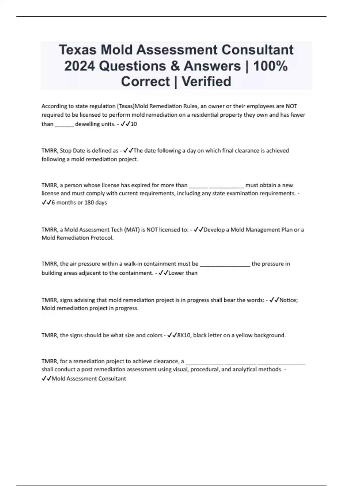Texas Mold Assessment Consultant 2024 Questions & Answers | 100% Correct | Verified