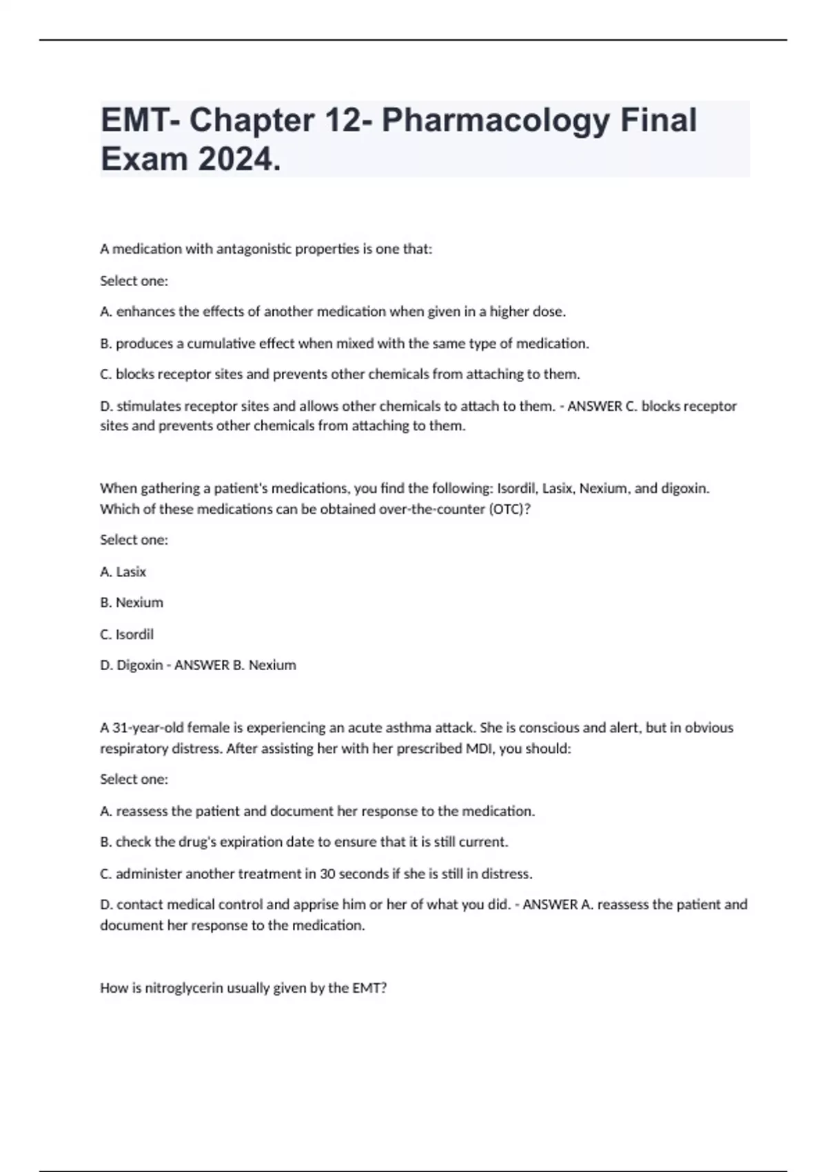 EMT- Chapter 12- Pharmacology Final Exam 2024. A medication with antagonistic properties is one that: Select one: A. enhances the effects of another medication when given in a higher dose. B. produces a cumulative effect when mixed with the same type of medication. C. blocks receptor sites and prevents other chemicals from attaching to them. D. stimulates receptor sites and allows other chemicals to attach to them. - ANSWER C. blocks receptor sites and prevents other chemicals from attaching to them. When gathering a patient's medications, you find the following: Isordil, Lasix, Nexium, and digoxin. Which of these medications can be obtained over-the-counter (OTC)? Select one: A. Lasix B. Nexium C. Isordil D. Digoxin - ANSWER B. Nexium A 31-year-old female is experiencing an acute asthma attack. She is conscious and alert, but in obvious respiratory distress. After assisting her with her prescribed MDI, you should: Select one: A. reassess the patient and document her response to the medication. B. check the drug's expiration date to ensure that it is still current. C. administer another treatment in 30 seconds if she is still in distress. D. contact medical control and apprise him or her of what you did. - ANSWER A. reassess the patient and document her response to the medication.