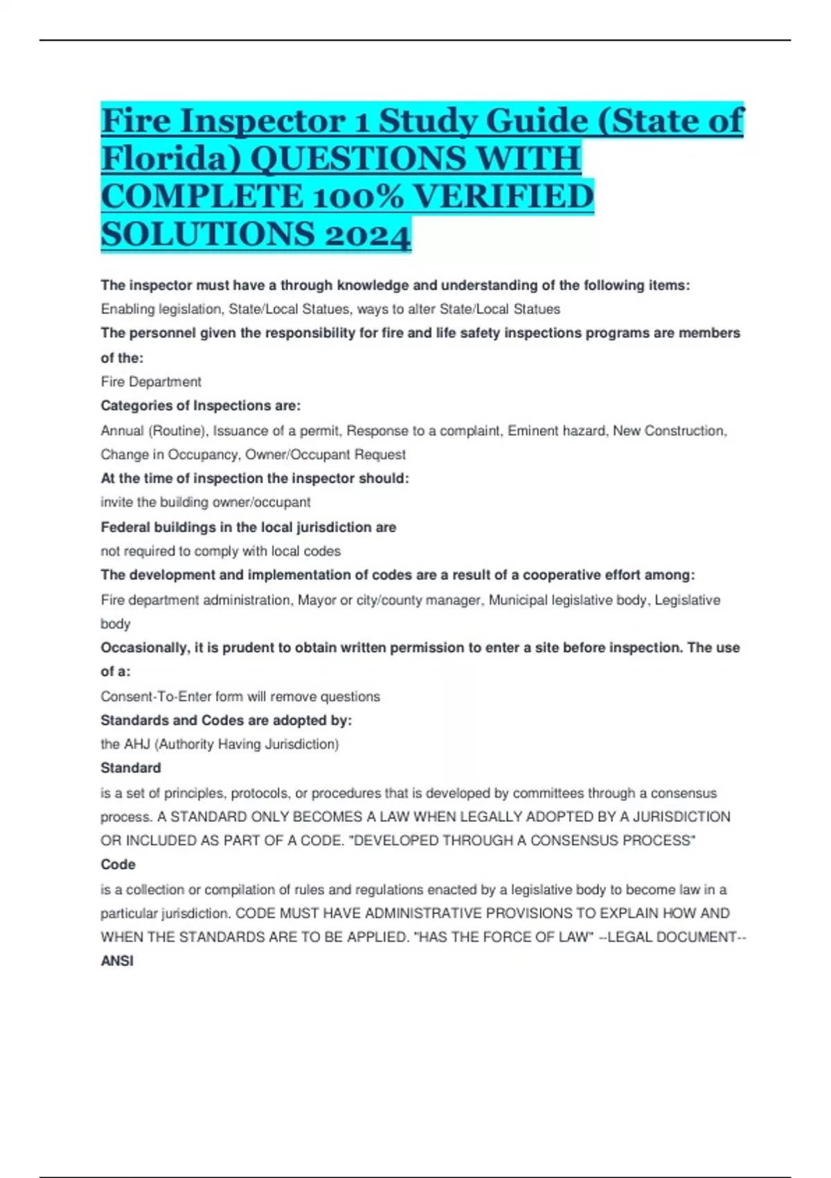 Fire Inspector 1 Study Guide (State of Florida) QUESTIONS WITH COMPLETE 100% VERIFIED SOLUTIONS 2024